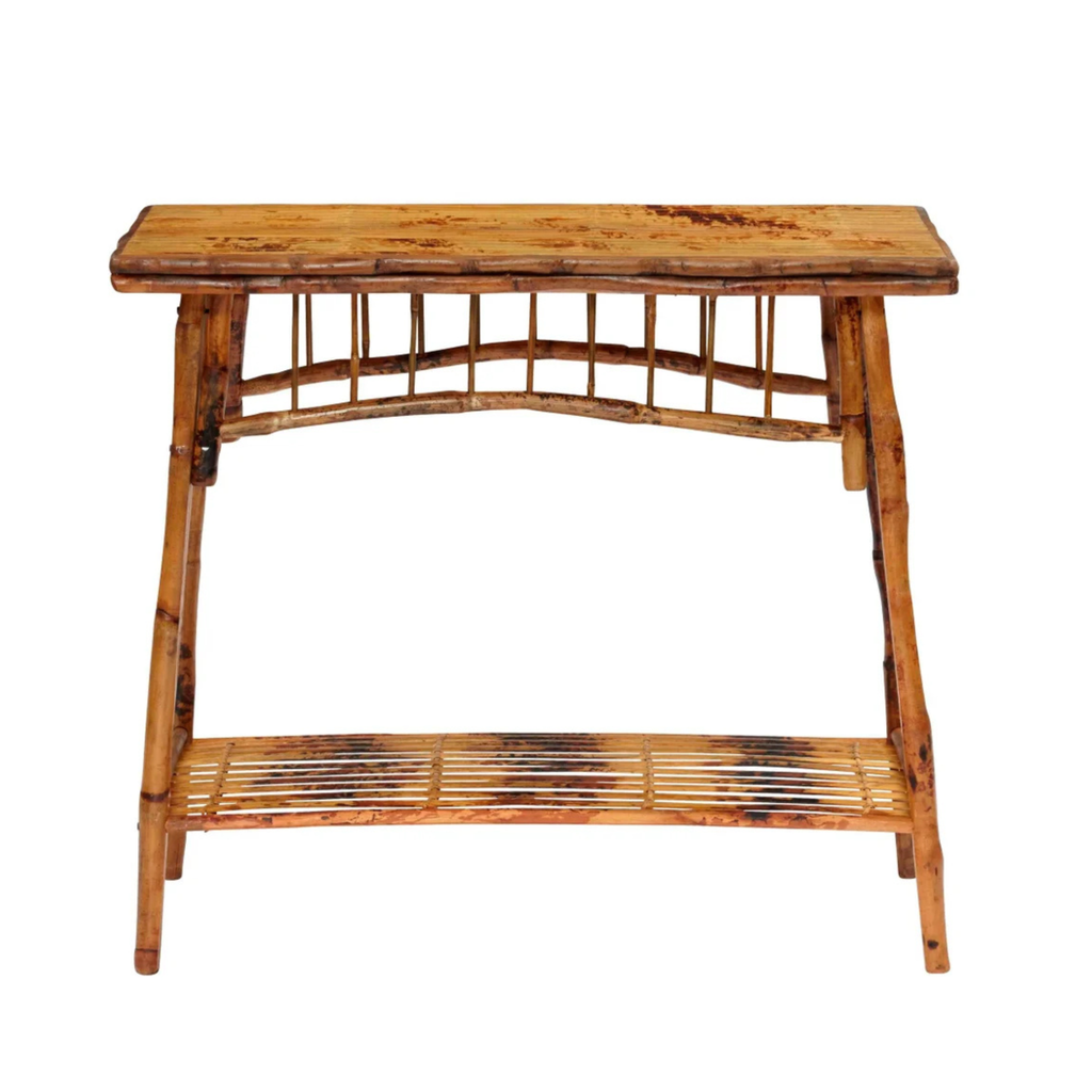 The Windward Console Table brings a relaxed island elegance to any hallway, entry, or living space. Its curved apron design and slatted lower shelf give a nod to British Colonial craftsmanship, while the bamboo-style frame and antique tortoise finish add warmth and texture. Narrow and refined, it's the perfect accent for smaller spaces needing a touch of character.