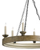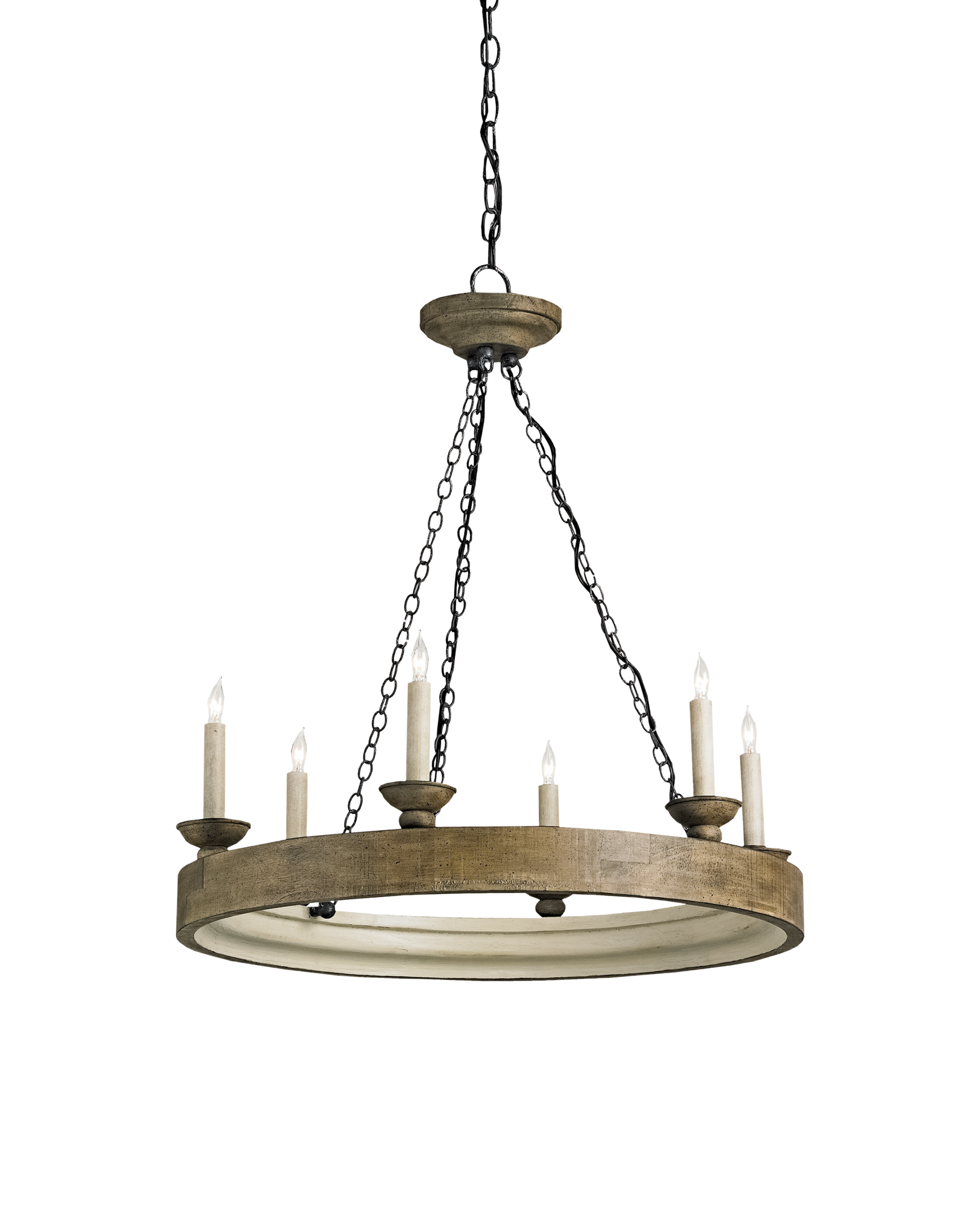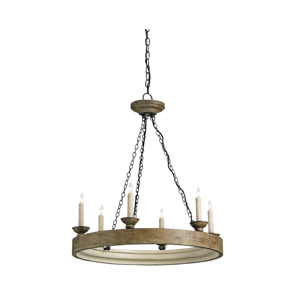 Crafted from wood and wrought iron, this six light chandelier delivers soft ambient illumination while adding architectural presence overhead. It is substantial without feeling heavy, making it a beautiful anchor above a dining table or kitchen island.
