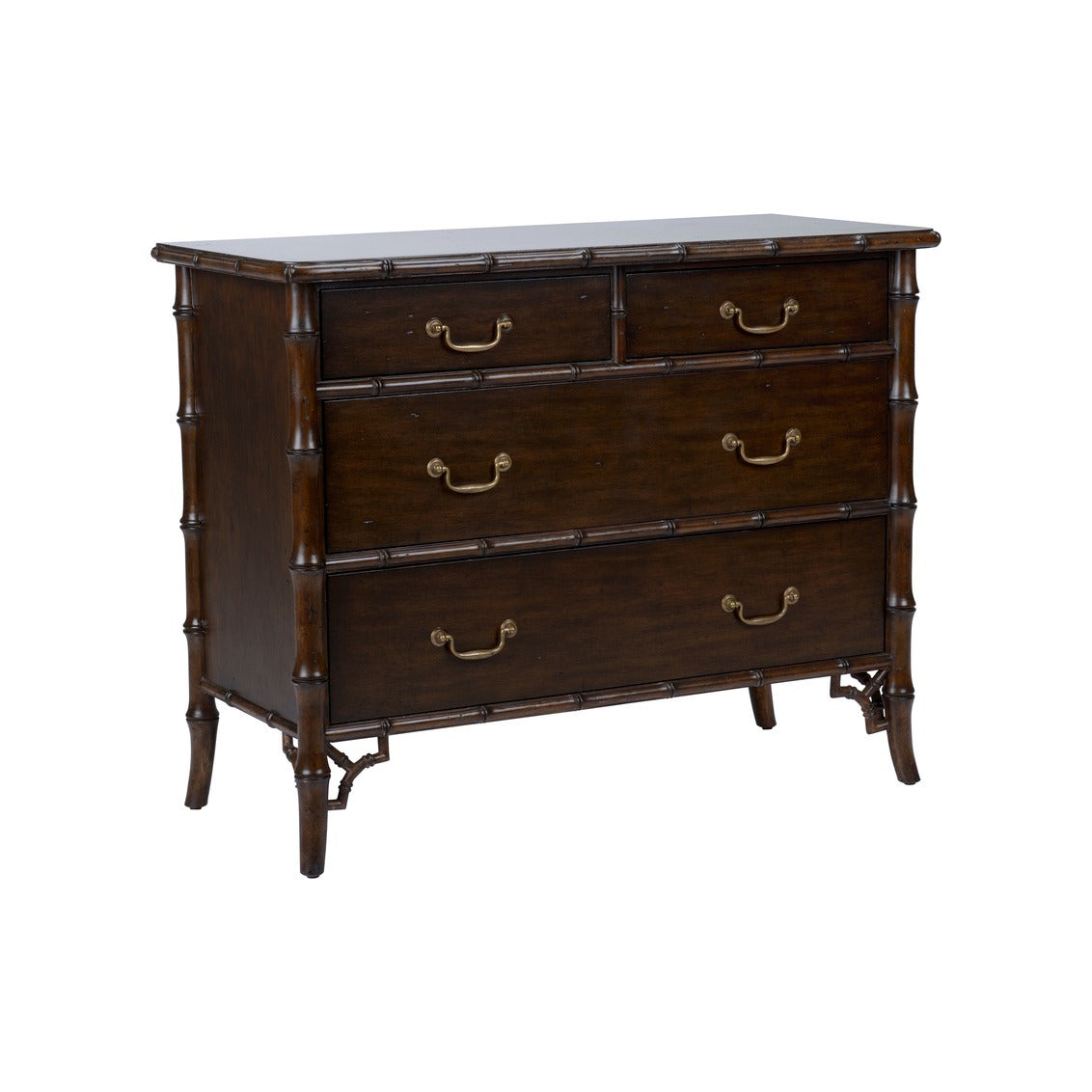 The Kensington Chest brings tailored elegance to any room with its warm brown finish, bamboo inspired detailing, and classic brass hardware. Designed with clean lines and subtle decorative accents, this four drawer chest feels both timeless and quietly distinctive, offering just the right amount of character without overwhelming a space. Its versatile scale makes it equally suited for bedrooms, entryways, or living areas where refined storage is needed.