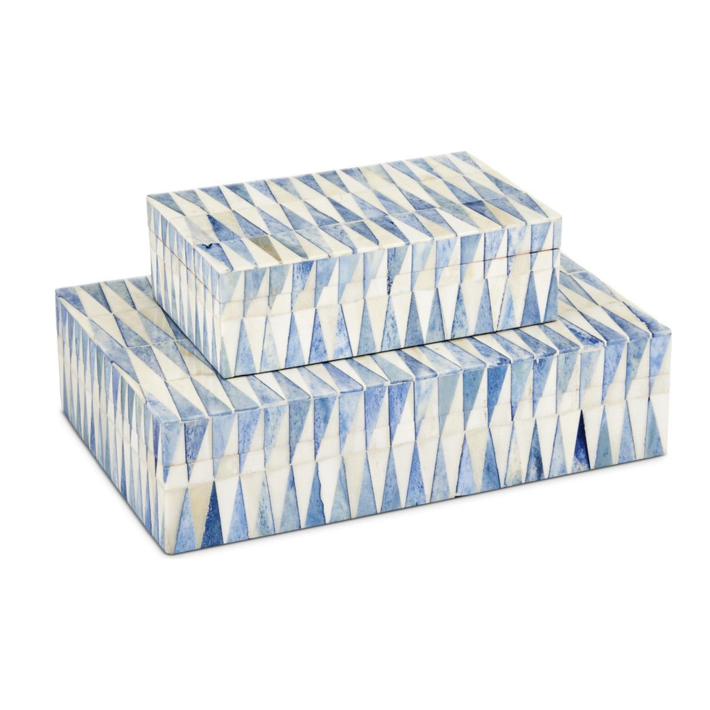 The Halston Box Set includes two beautifully crafted decorative boxes, each featuring hand-applied bone inlay in alternating shades of blue and ivory. The striking geometric pattern adds both texture and artisan detail, making them a standout accent for any shelf, console, or coffee table. Lined with linen for a tailored finish, these boxes are as functional as they are elegant—ideal for storing keepsakes or everyday essentials with style.
