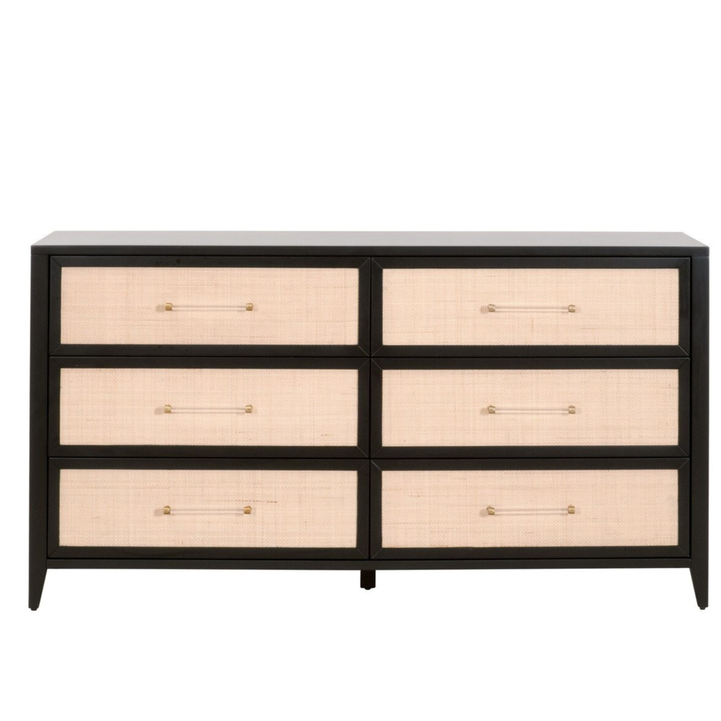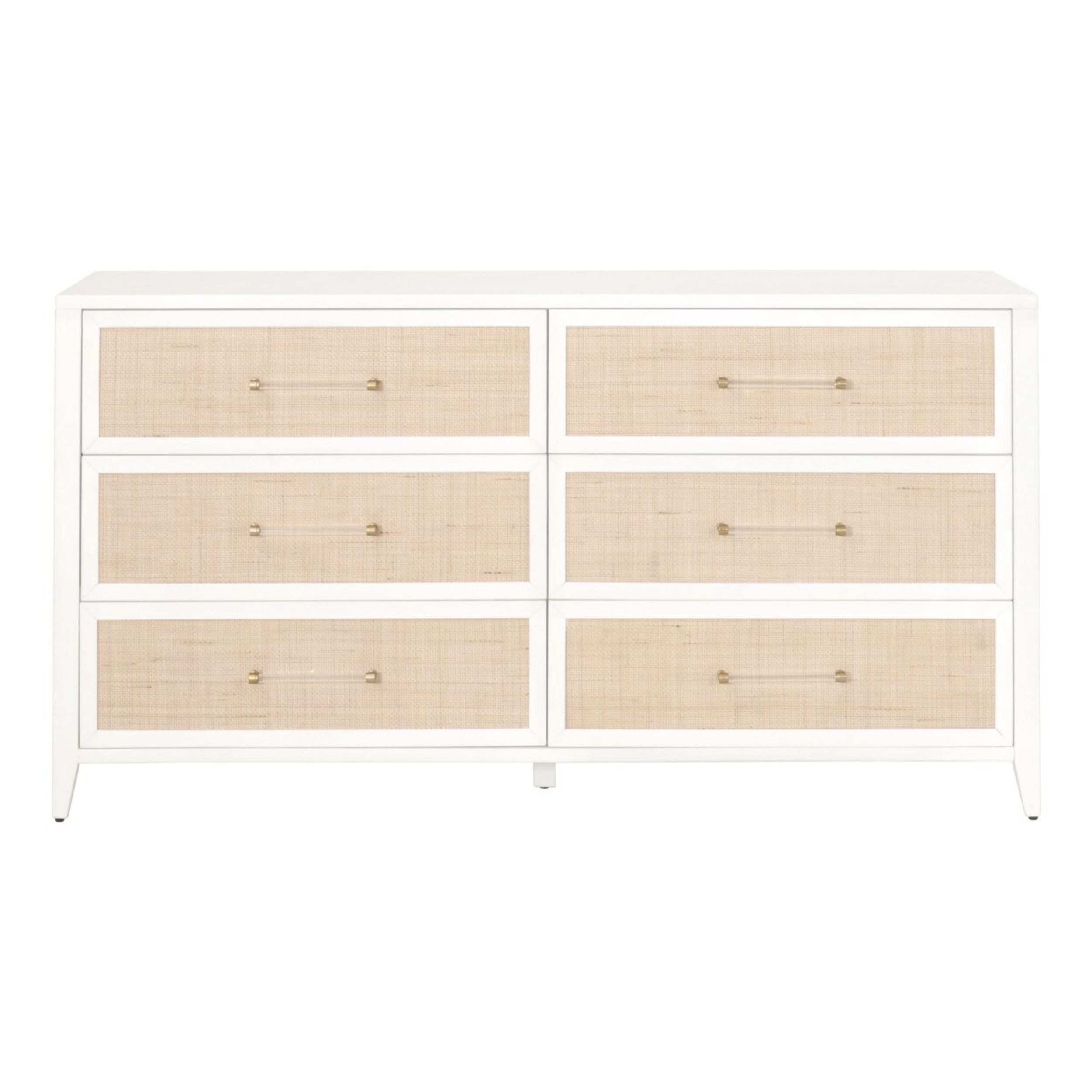 • Available in multiple finishes including Matte White with woven natural rattan drawer fronts