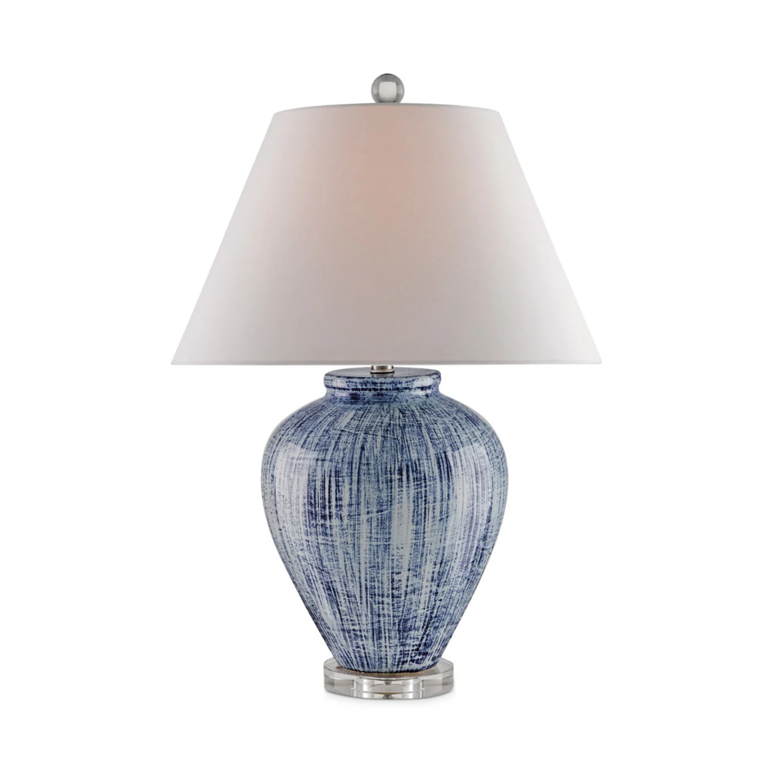The Ainsley Blue Table Lamp is crafted from hand-glazed ceramic with a rich blue and white brushstroke finish inspired by traditional Dutch pottery. Each lamp is artisan-made, giving it a unique texture and character. A clear acrylic base and optic crystal finial add a polished modern touch, while the crisp white linen empire shade completes the timeless design.