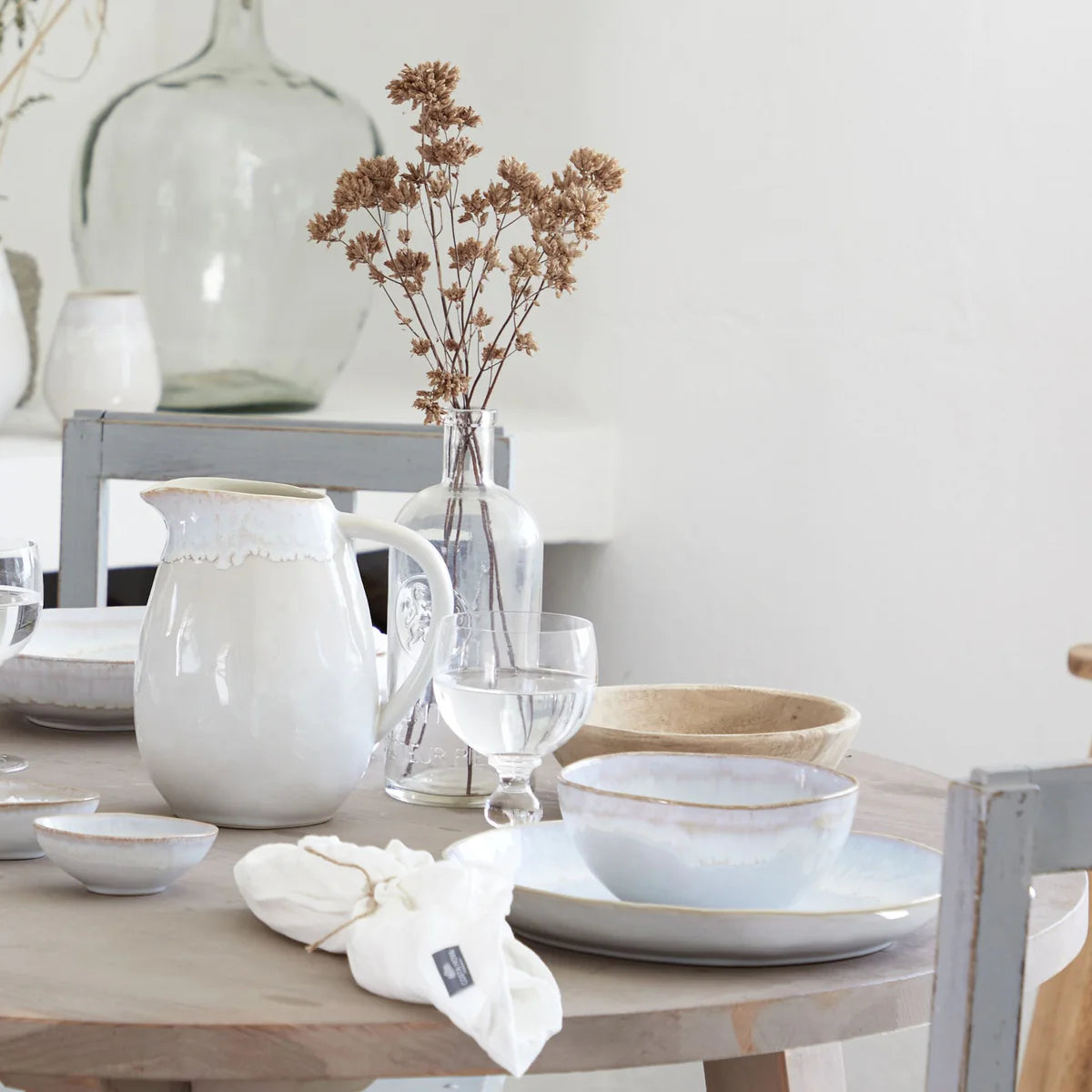 Inspired by the soft ocean breezes and coastal cliffs of Portugal’s Algarve, the Brisa Pitcher brings an effortless, organic elegance to everyday dining. Each piece is handcrafted from fine stoneware and finished with Brisa’s signature reactive glaze, creating subtle layers of white and soft blue that ensure no two pieces are exactly alike.