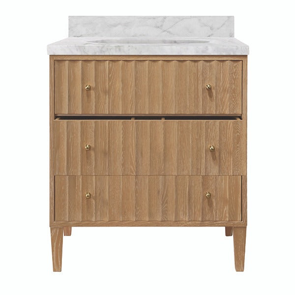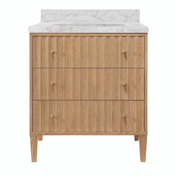 The Odin 30.5 Inch Fluted Oak Bathroom Vanity is designed for powder rooms and smaller bathrooms that still deserve thoughtful detail. Crafted in cerused oak with vertical fluted drawer fronts, it brings texture and warmth while maintaining a tailored, architectural feel.