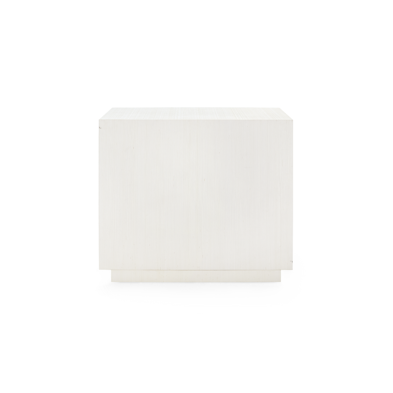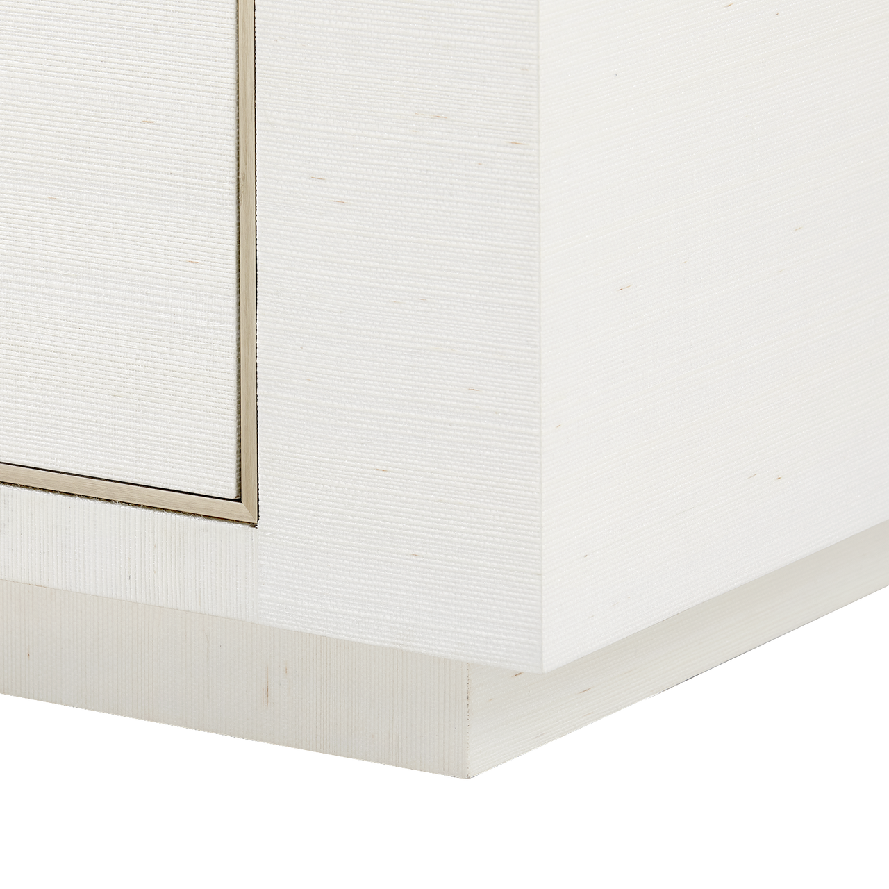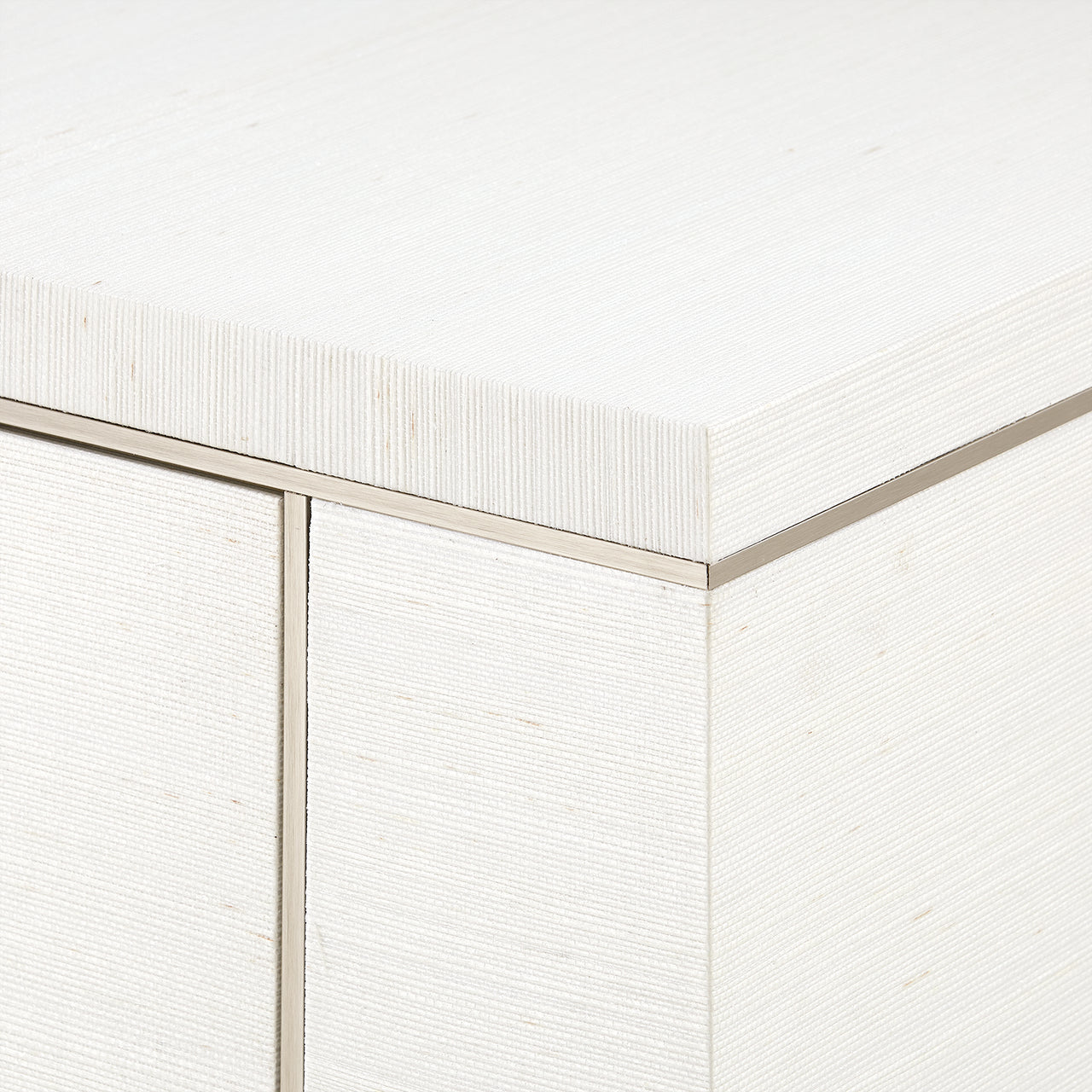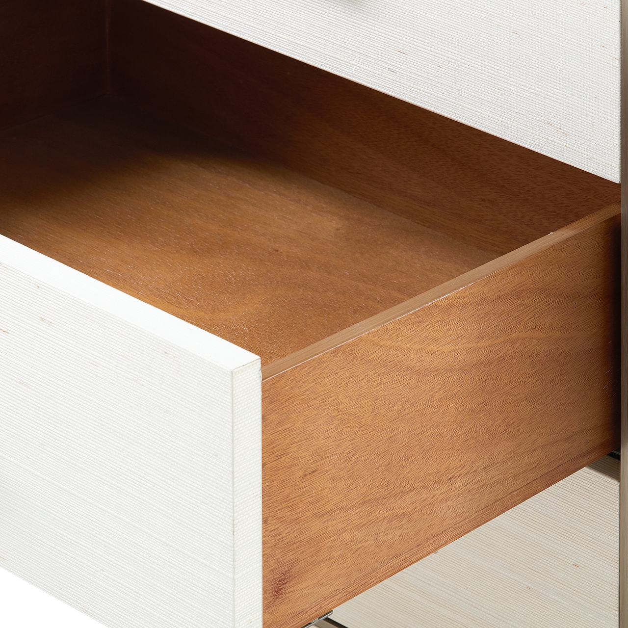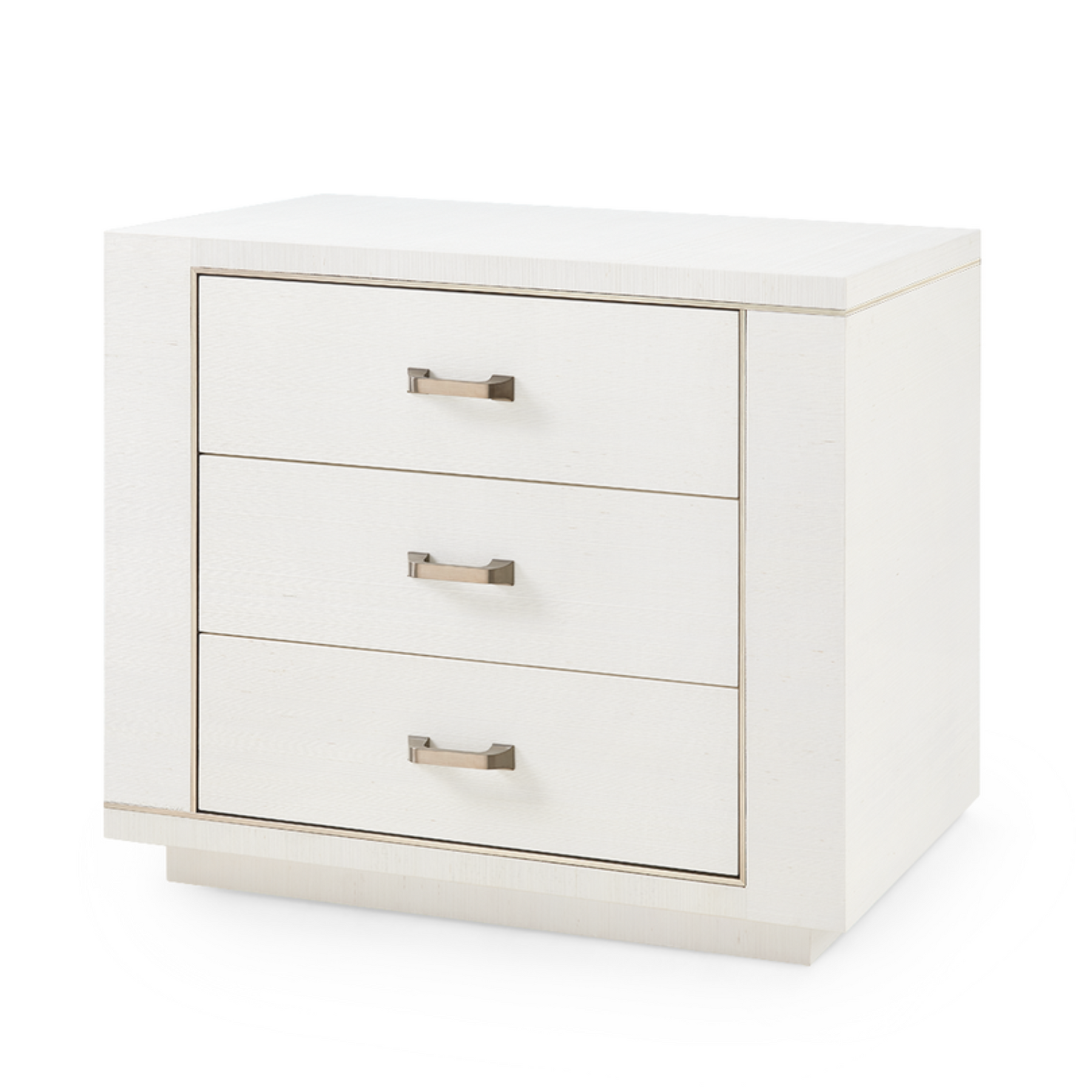 The Ethan Nightstand in Sand White is hand-lacquered grasscloth with asymmetrical satin bronze hardware — a 32" wide three-drawer bedside piece where the warm sand white finish and woven grasscloth texture make a bedroom feel intentional and refined. The sand white is warmer than a standard white, with enough depth to work with natural linens, warm wood floors, and the organic palettes of coastal and transitional interiors. Three soft-close drawers with dovetail joinery provide organized bedside storage.
