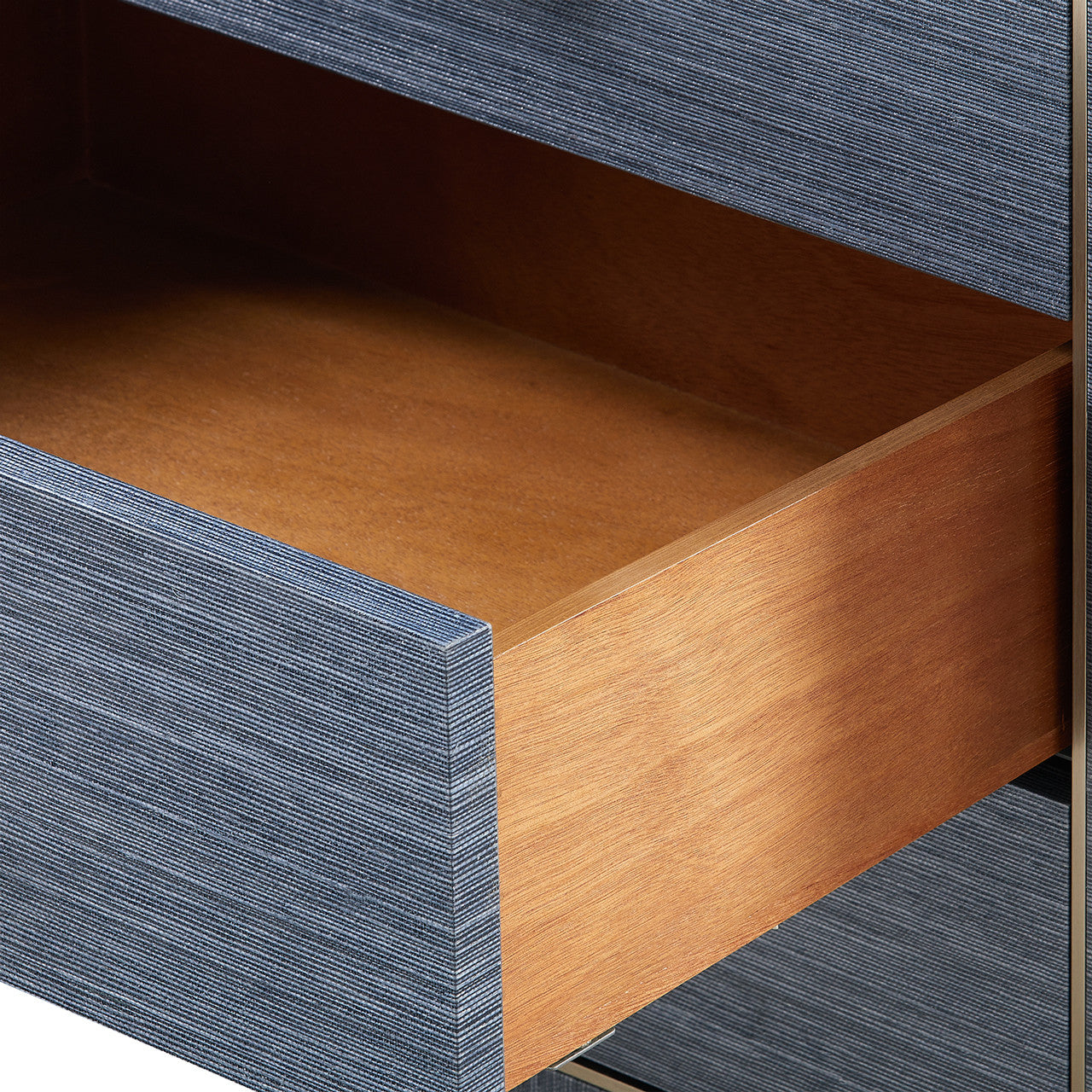 Material: Wood frame wrapped in lacquered grasscloth; stained drawer interiors