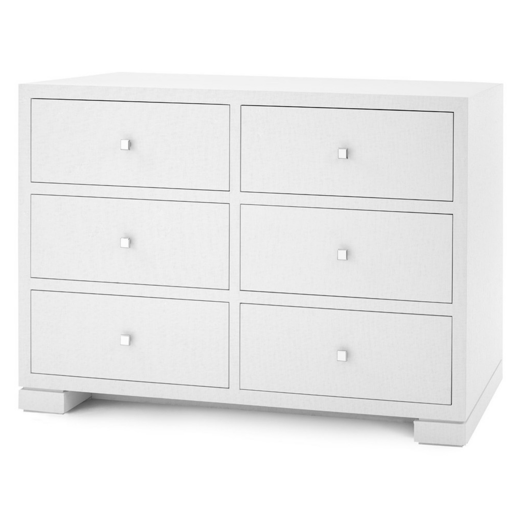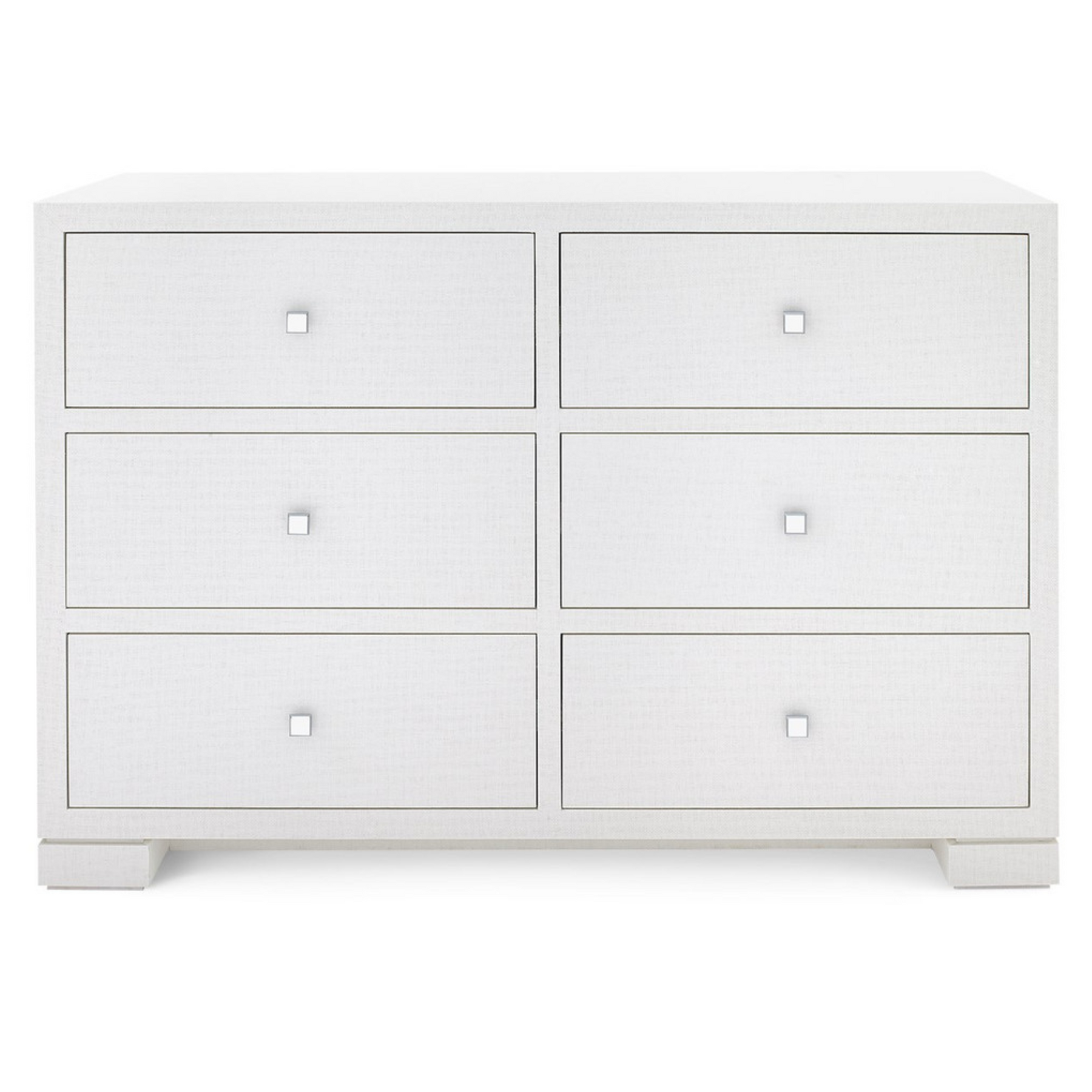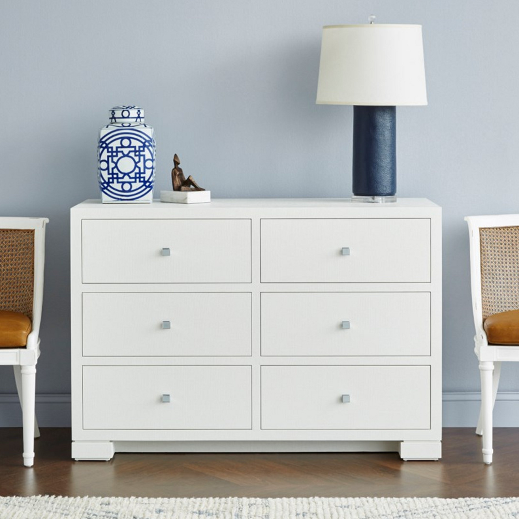 The Frances Extra Large Dresser in Chiffon White is lacquered grasscloth with chrome-finished square pulls — six drawers of refined storage in a clean, textured white finish.