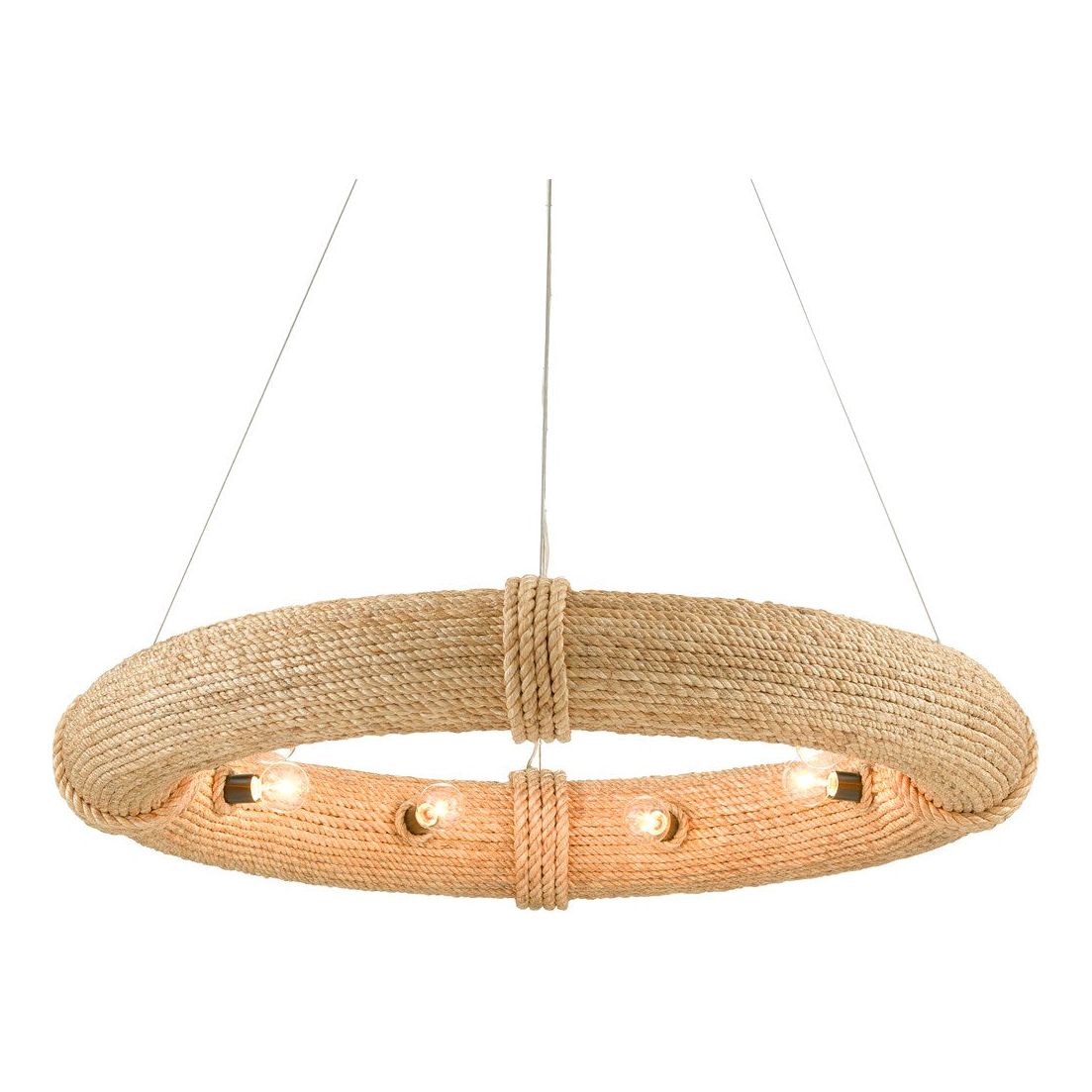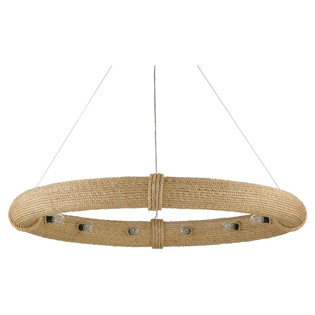 Abaca rope chandelier with a bold circular silhouette, designed to bring texture and architectural presence to dining rooms, entryways, and large open spaces. Wrapped in natural fibers over a structured wrought iron frame, the form feels both grounded and airy at the same time.