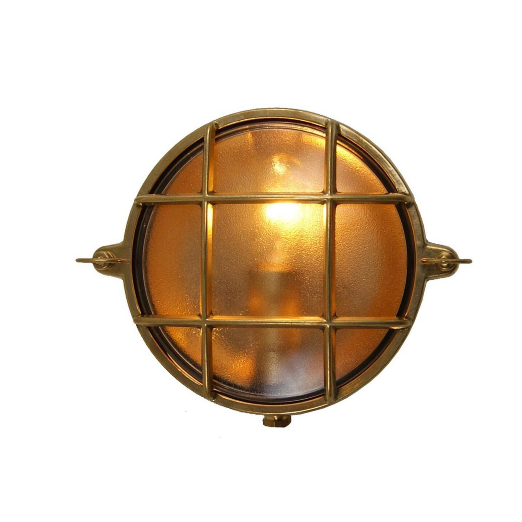 - Solid brass and glass bulkhead — damp rated for outdoor wall or ceiling use