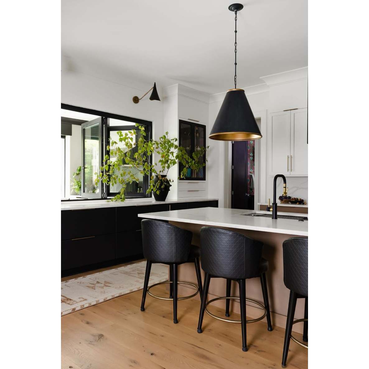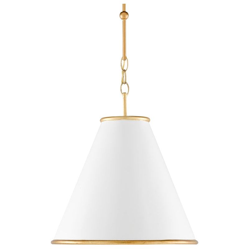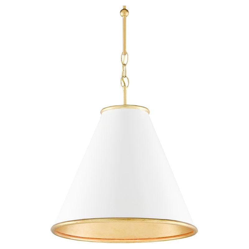 Wrought iron pendant with a clean, structured silhouette, designed to bring focused, warm light to kitchens, dining spaces, and entryways. The tapered shade creates a tailored profile, while the softly reflective gold interior enhances the light and adds depth.