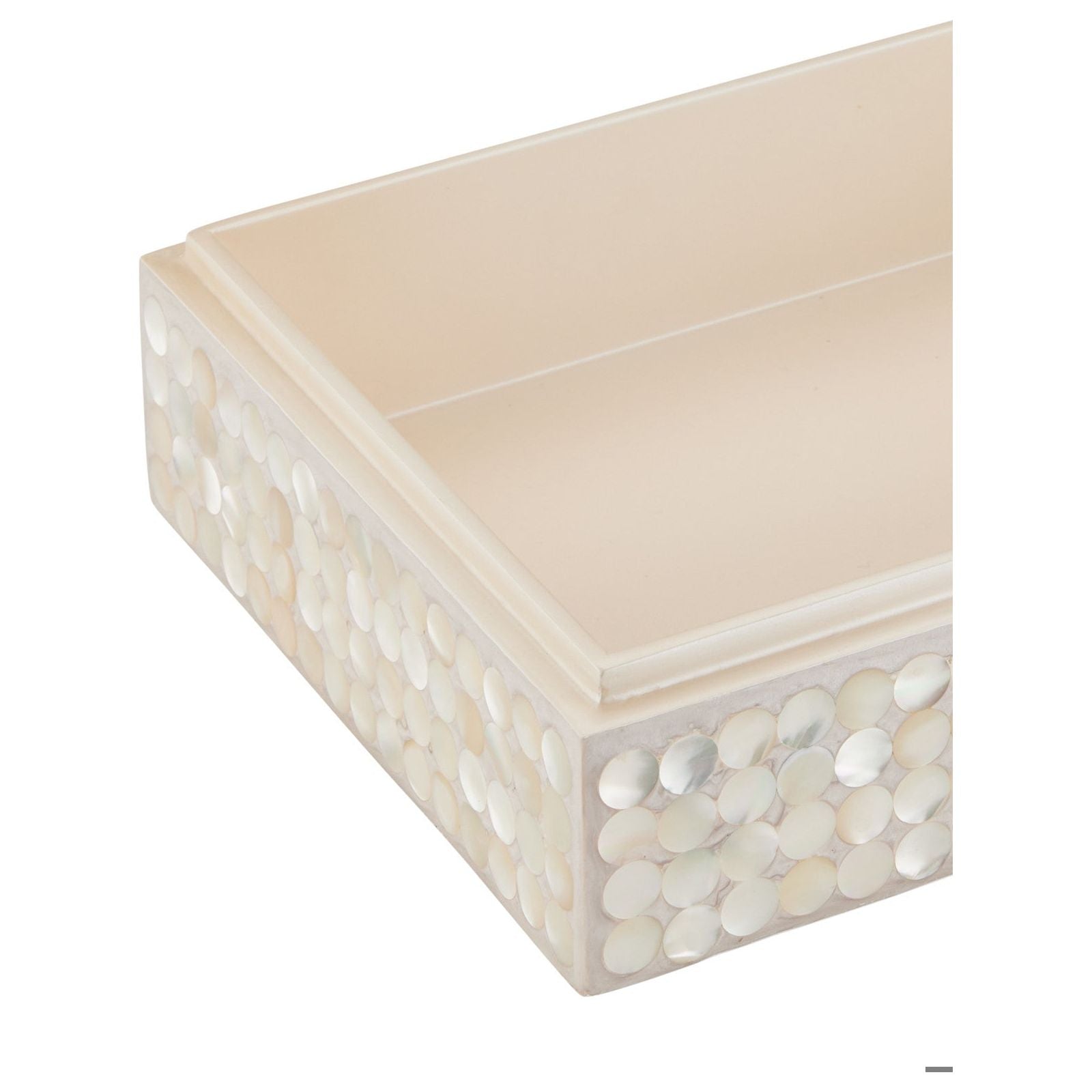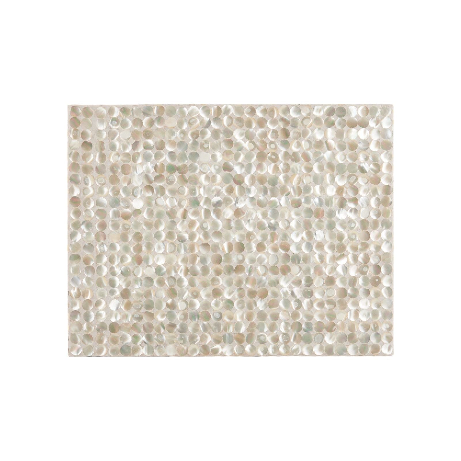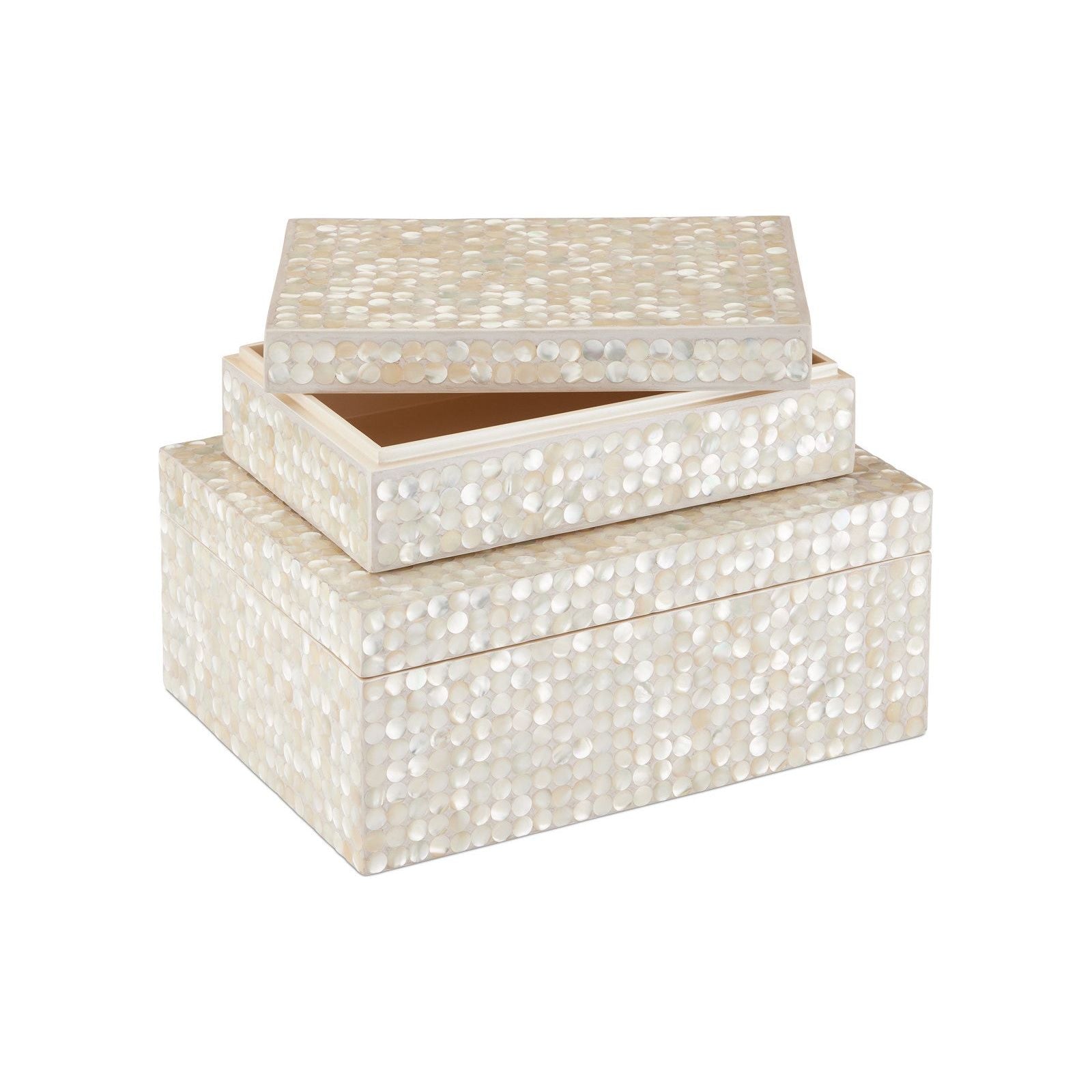 The Thistle Pearl Box Set is a luminous pair of decorative boxes, each adorned with petite mother-of-pearl circles hand-set into creamy white composite. The meticulous placement of these shell discs creates a subtle shimmer and refined texture that elevates any surface. With their crisp palette and intricate detailing, these boxes bring quiet sophistication to dressers, consoles, or built-ins.