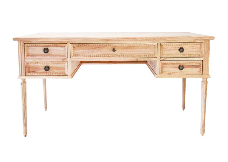The Colette Desk brings a graceful blend of femininity and function to your space, drawing inspiration from refined French neoclassical design. With its light oak finish, intricate carvings, fluted legs, and antique brass hardware, this piece is as elegant as it is timeless.