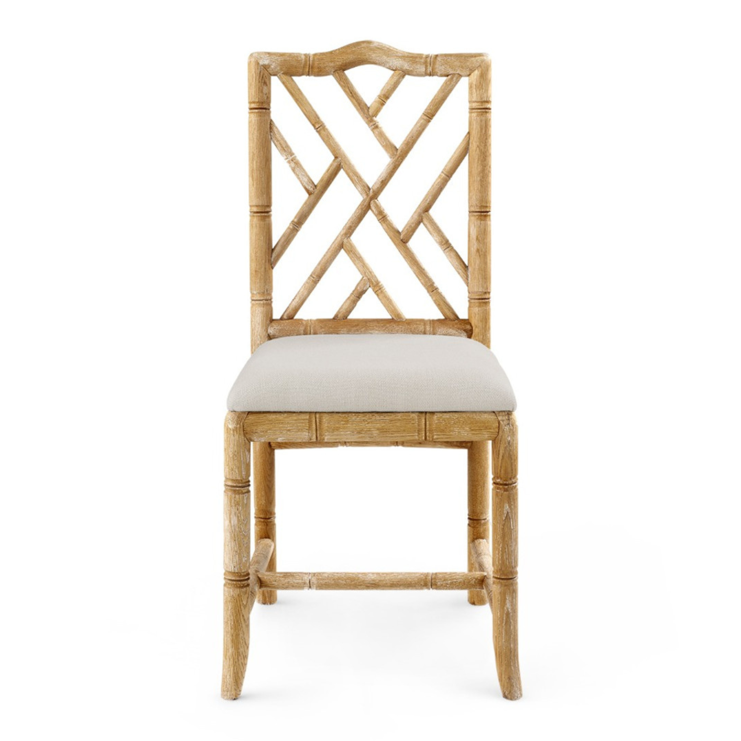 Laid-back luxury meets coastal refinement in the Hampton Side Chair. Inspired by classic Chinoiserie design, its hand-carved frame mimics the look of bamboo, lending organic texture and a breezy, Pacific-inspired feel. The open fretwork back and gently curved legs add elegant detail, while the natural linen seat offers comfort without formality.