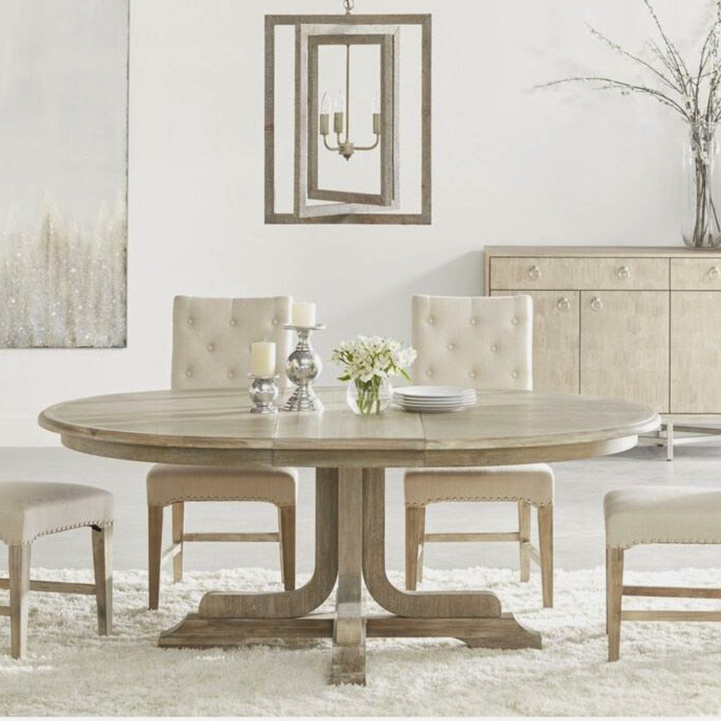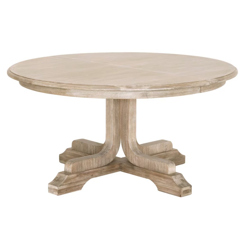 The Torrey 60" Extension Dining Table is a versatile solution for both everyday dining and special occasions. Crafted from solid and veneered acacia wood in a soft natural gray finish, its round silhouette extends to an oval shape with a removable leaf. Subtle woodgrain and wire-brushed texture offer a relaxed, coastal-inspired feel that blends seamlessly with traditional or transitional interiors.