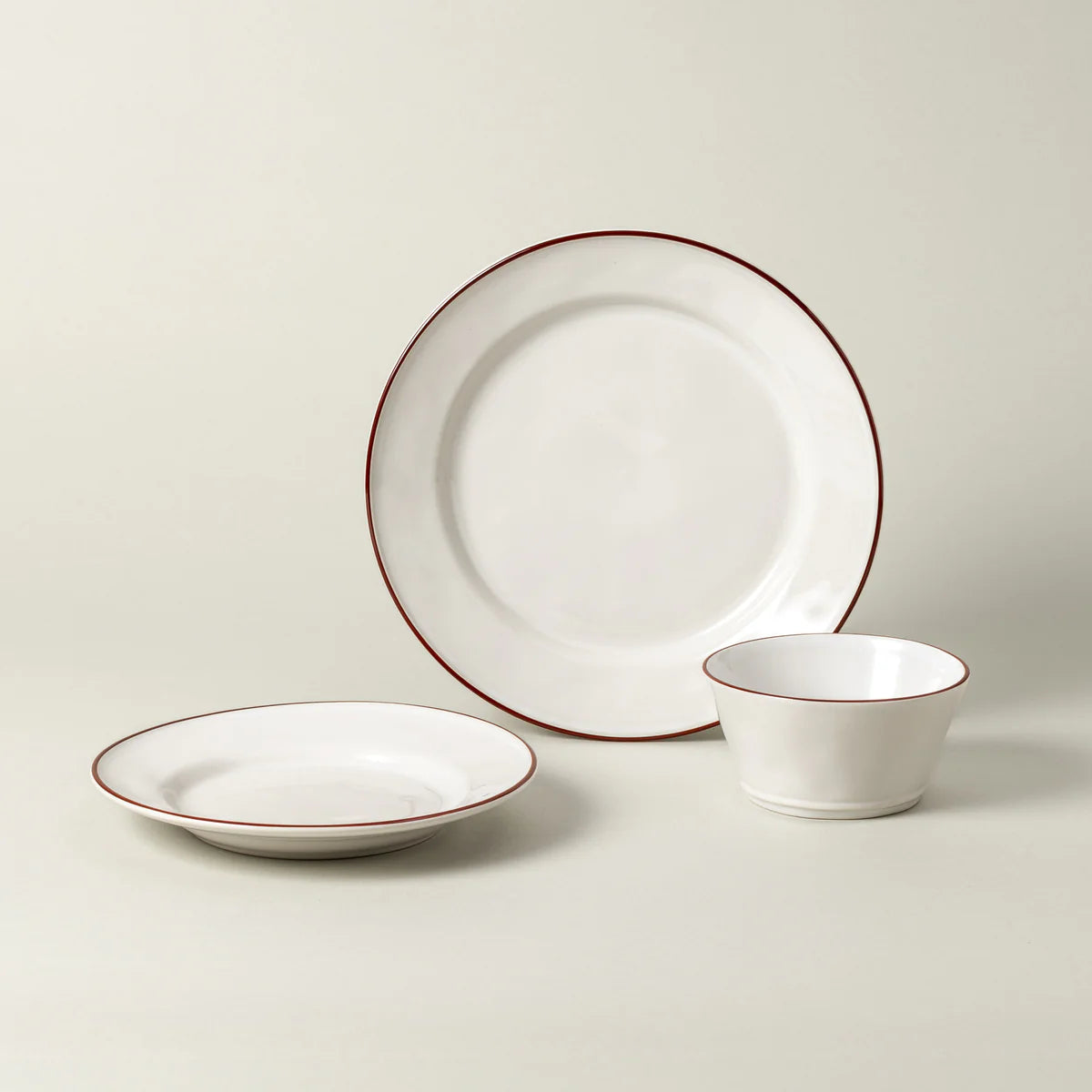 The Beja 12-Piece Dinnerware Set brings timeless European charm to the modern cottage table. Crafted in Portugal from fine stoneware, each piece is finished with a hand-painted rim—an Old-World detail that feels quietly elevated and unmistakably artisanal. The blend of soft white glaze with a red accent gives the set a warm, classic character that pairs beautifully with everyday meals or weekend gatherings.