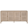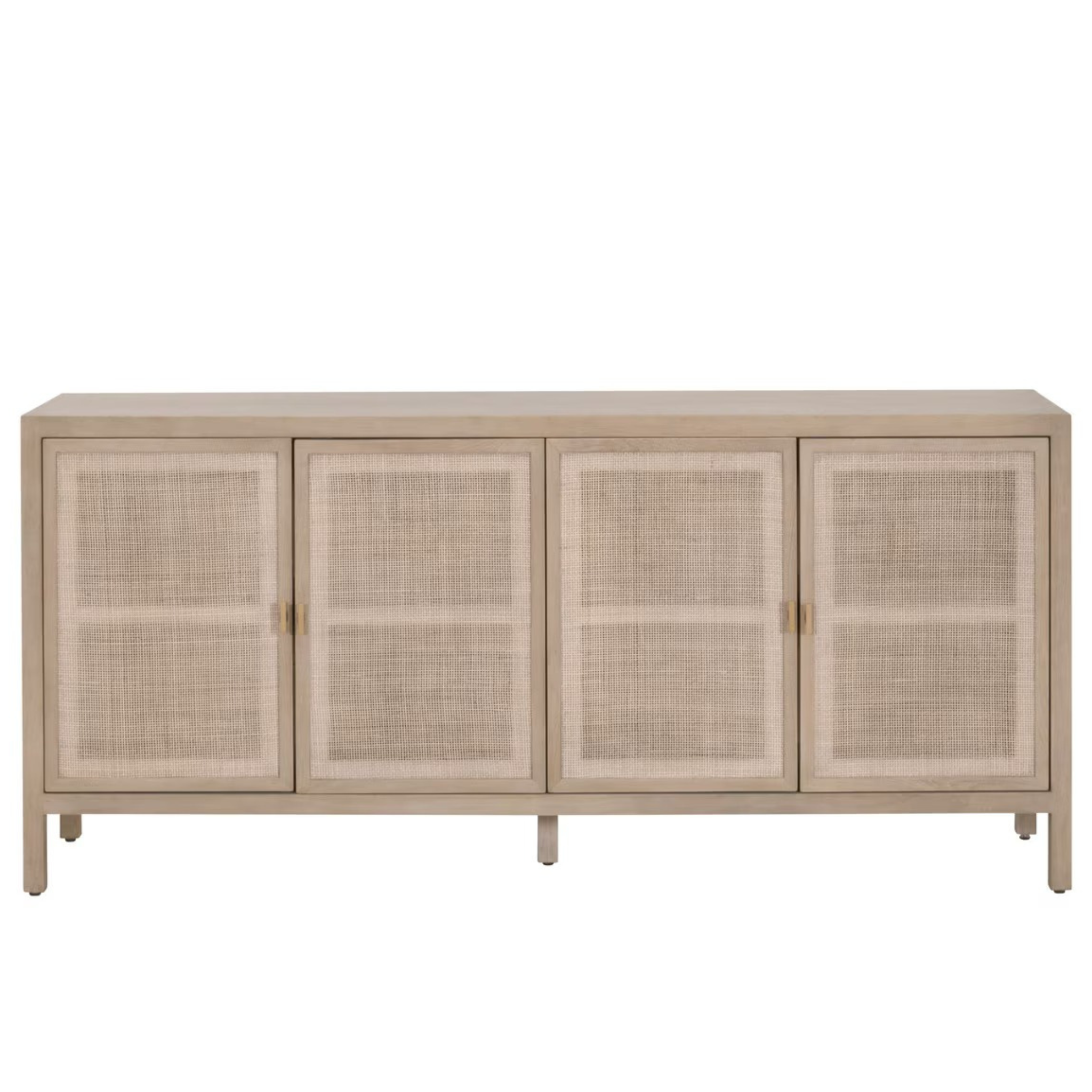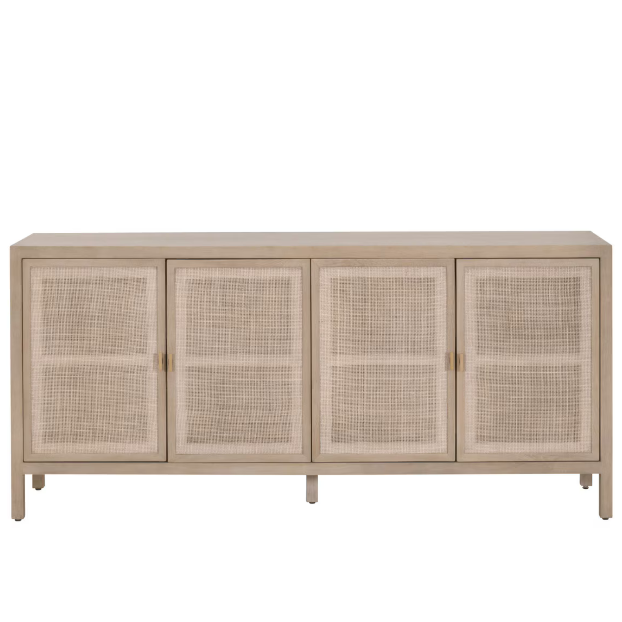 The Carina Media Sideboard blends timeless craftsmanship with modern function, making it a versatile addition to your living space. Featuring a cane front inlay framed by solid oak wood, this piece brings a subtle layer of texture and warmth to your home. Its Smoke Gray finish paired with brushed gold accents creates a refined, understated look that complements both casual and polished interiors.