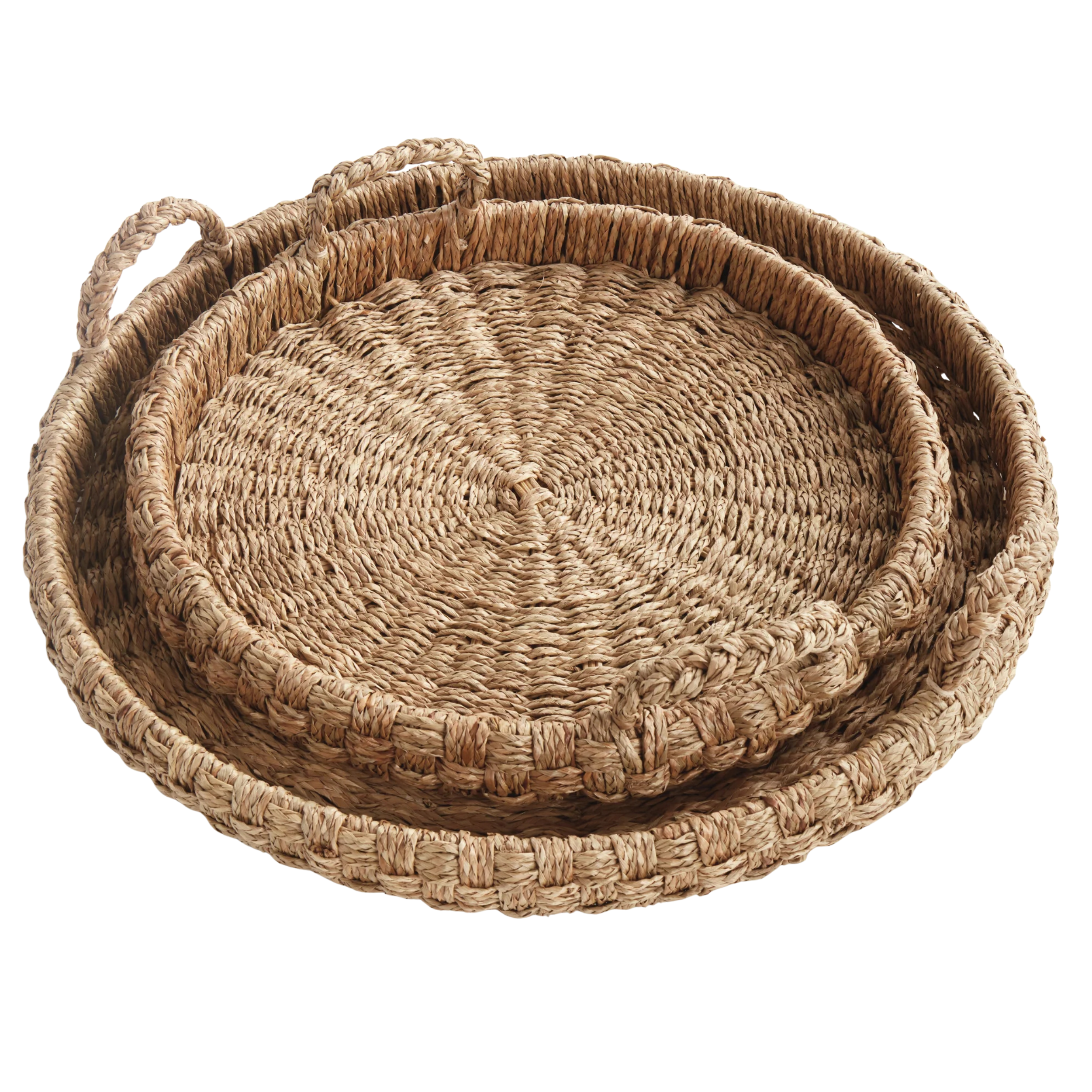 Each tray is handwoven and reinforced with a hidden wire frame for added durability. With practical handles and refined texture, this set works effortlessly in both casual and styled spaces—from traditional to coastal homes.
