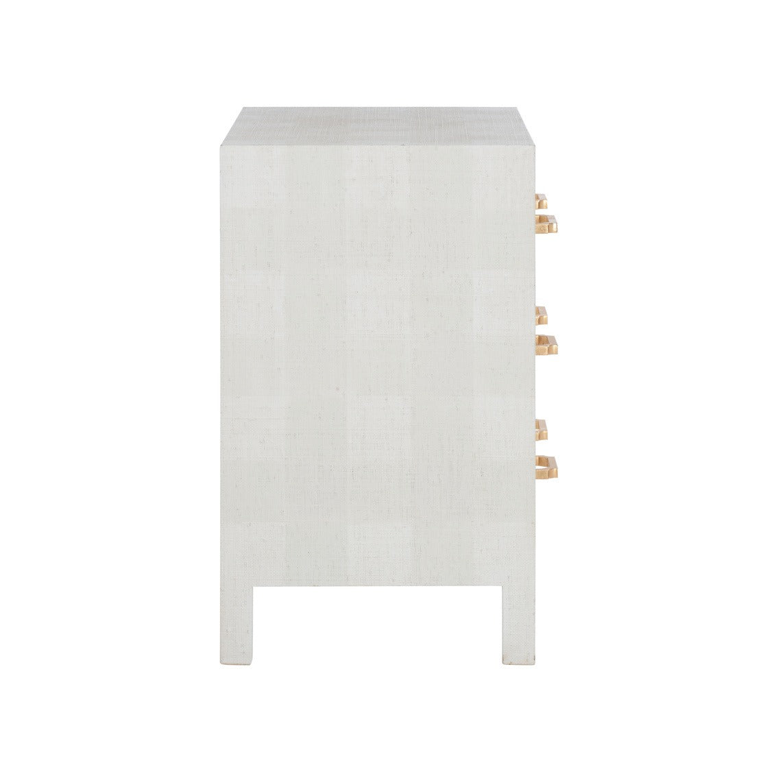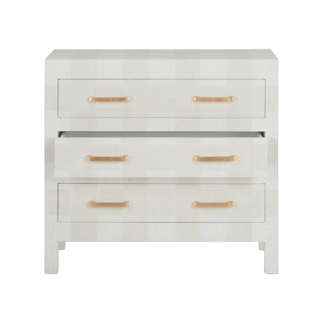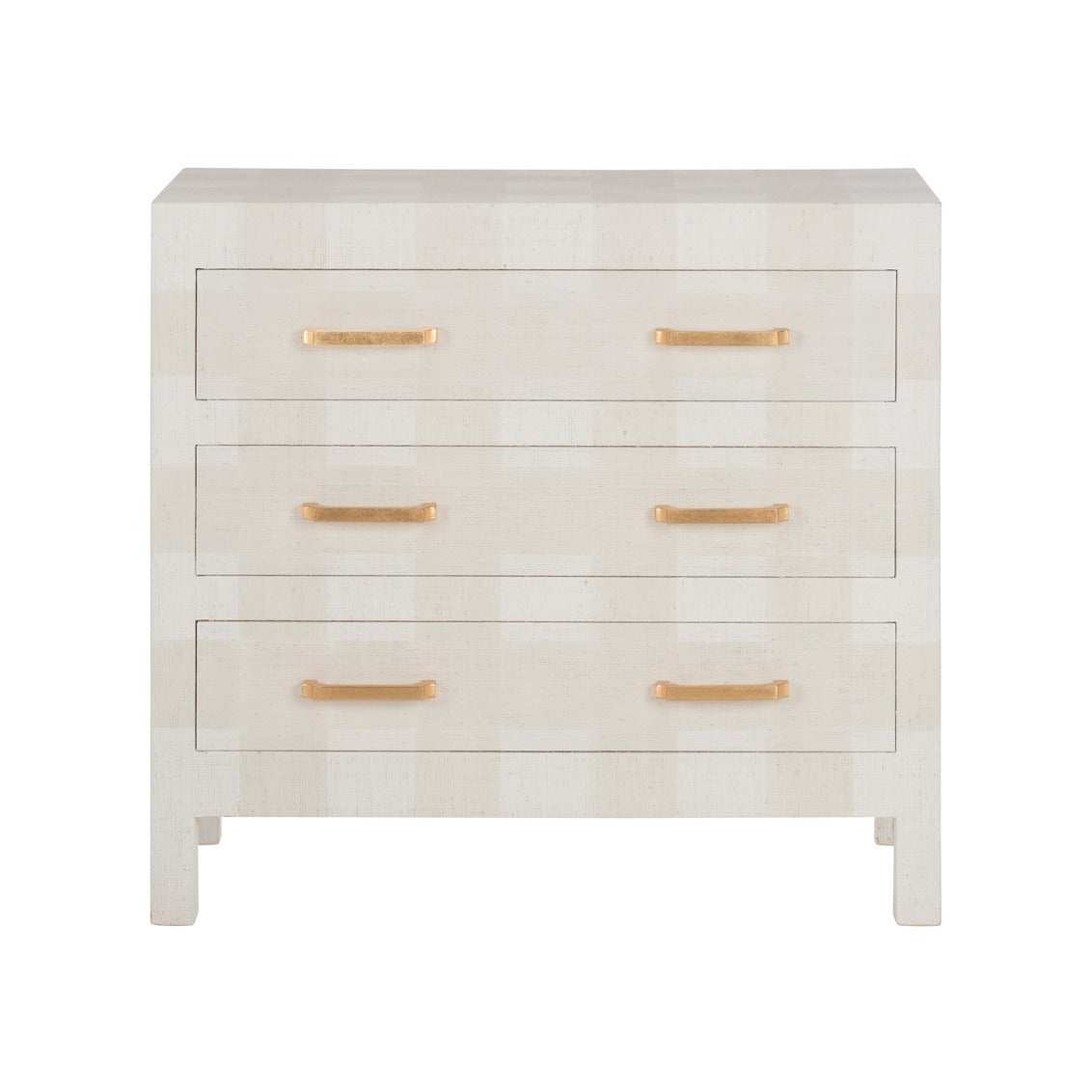 The Gracious Chest – Plaid brings quiet sophistication to the bedroom or living area with its subtle, tailored design. Featuring a refined plaid pattern in soft white and beige, this three-drawer chest blends texture and tone beautifully. The sleek gold hardware adds a polished touch, balancing warmth with understated glamour. Perfect for a coastal, classic, or transitional setting, it’s a piece that feels both timeless and distinctly modern.