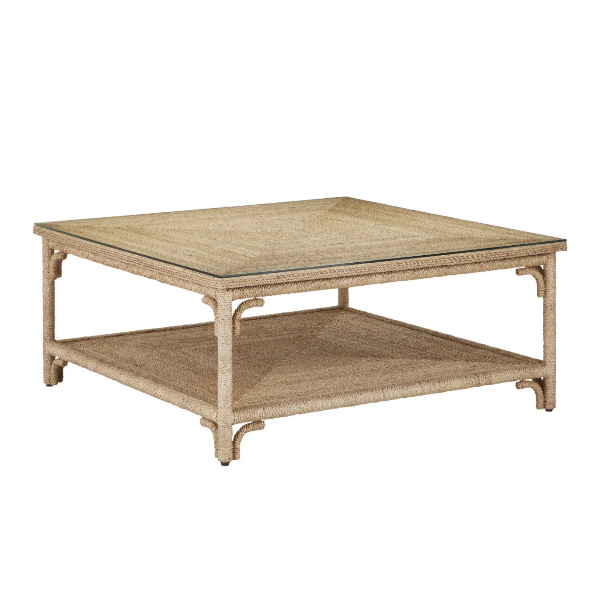 The Harbor View Cocktail Table brings a natural elegance with its earthy mix of rattan and wicker, covered in hand-braided abaca rope. Its square profile is topped with clear glass, providing both function and protection for the woven surface. The design highlights the craftsmanship required to create such a piece, making it a standout addition to coastal or transitional interiors.