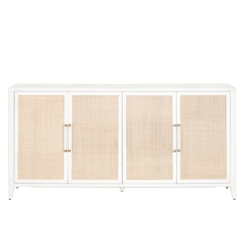 The Holland Media Sideboard blends natural texture with a crisp Matte White finish, creating a clean-lined piece that feels both relaxed and tailored. Featuring woven rattan door inlays, decorative brass and acrylic handles, and thoughtful cord management, this sideboard balances style and function. It’s a versatile anchor piece—perfect for media storage, entertaining essentials, or linens.