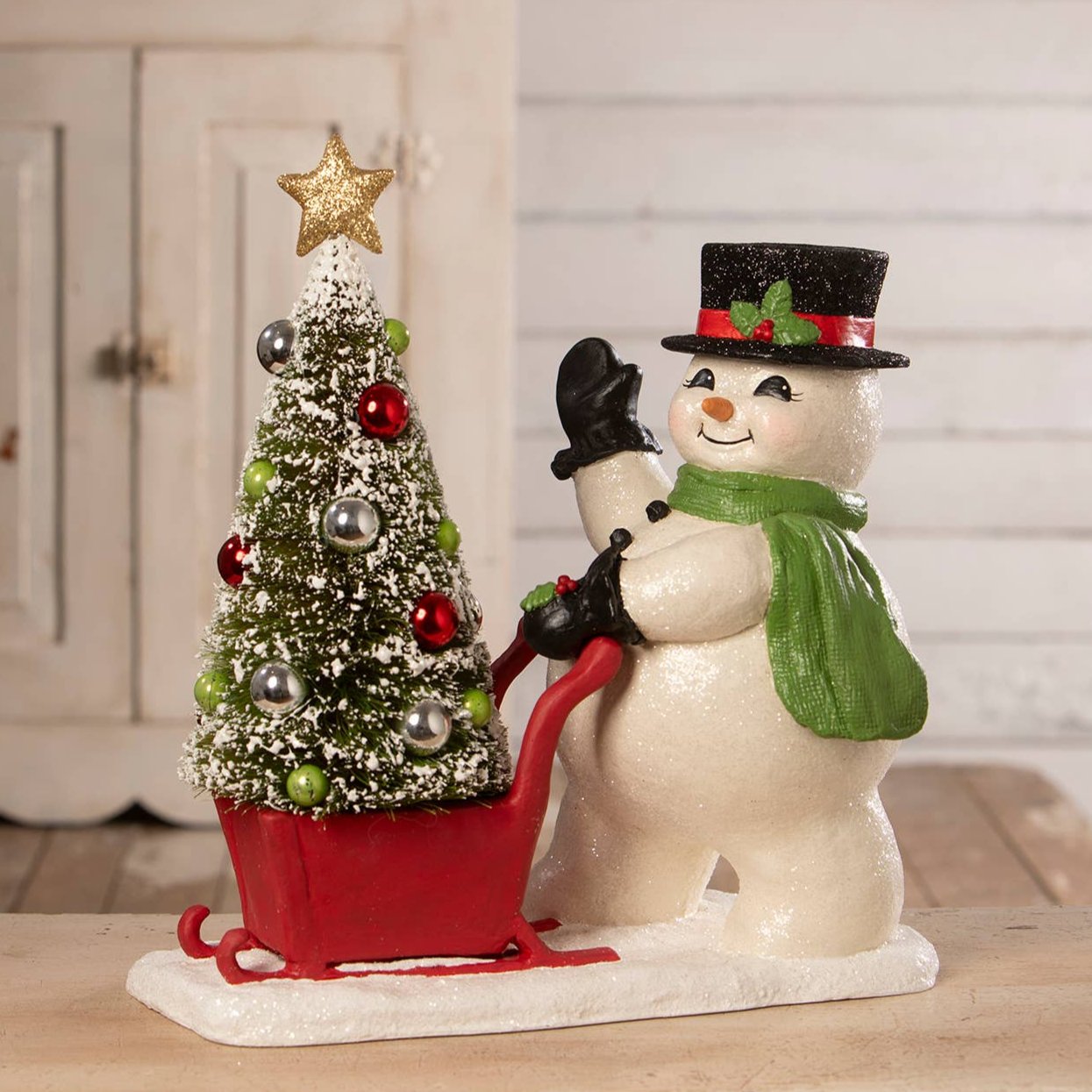 This Frosty pushing sled is out for the day showing off his beautiful Christmas tree. Frosty is wearing a black glittered top hat with a metallic red band and a green scarf.
