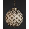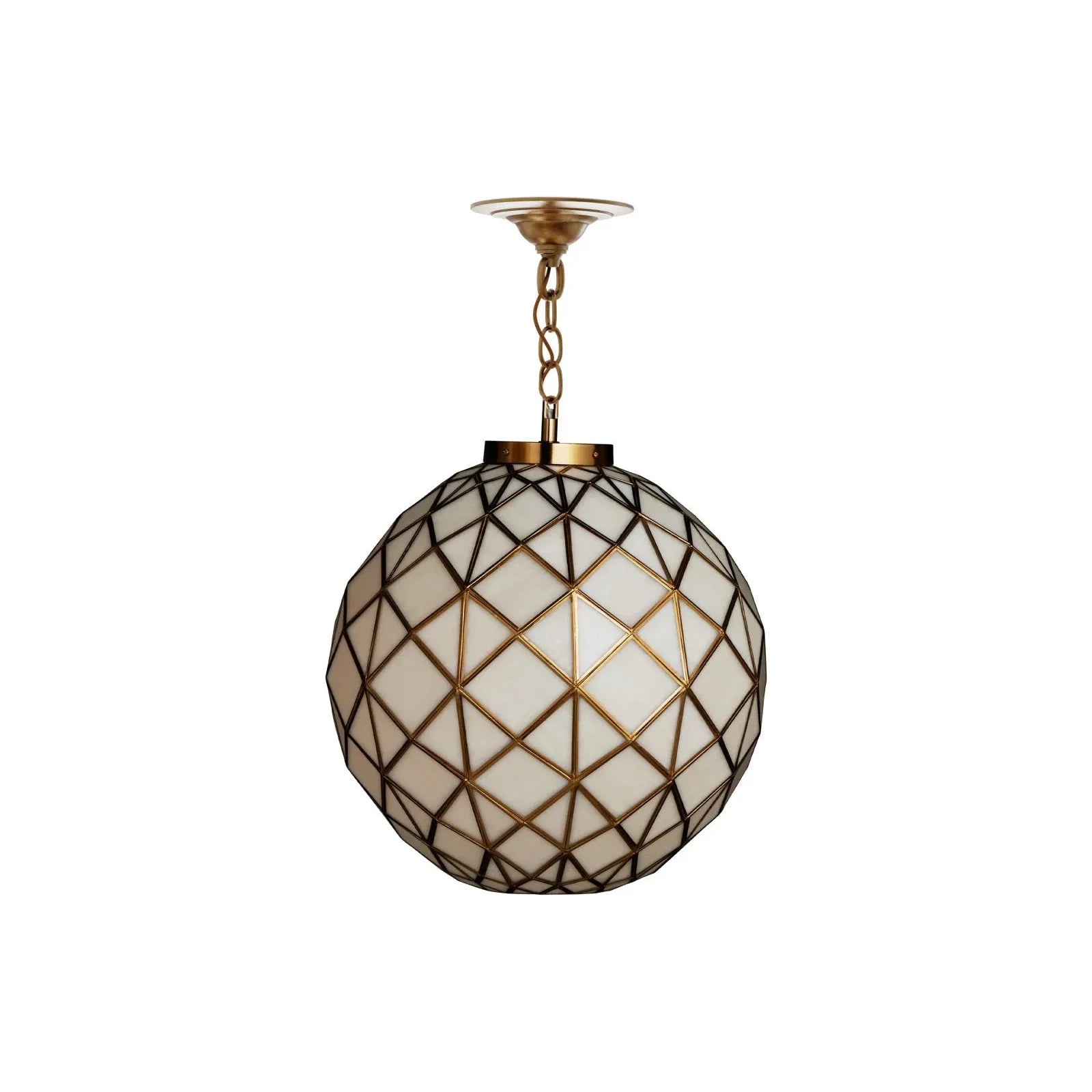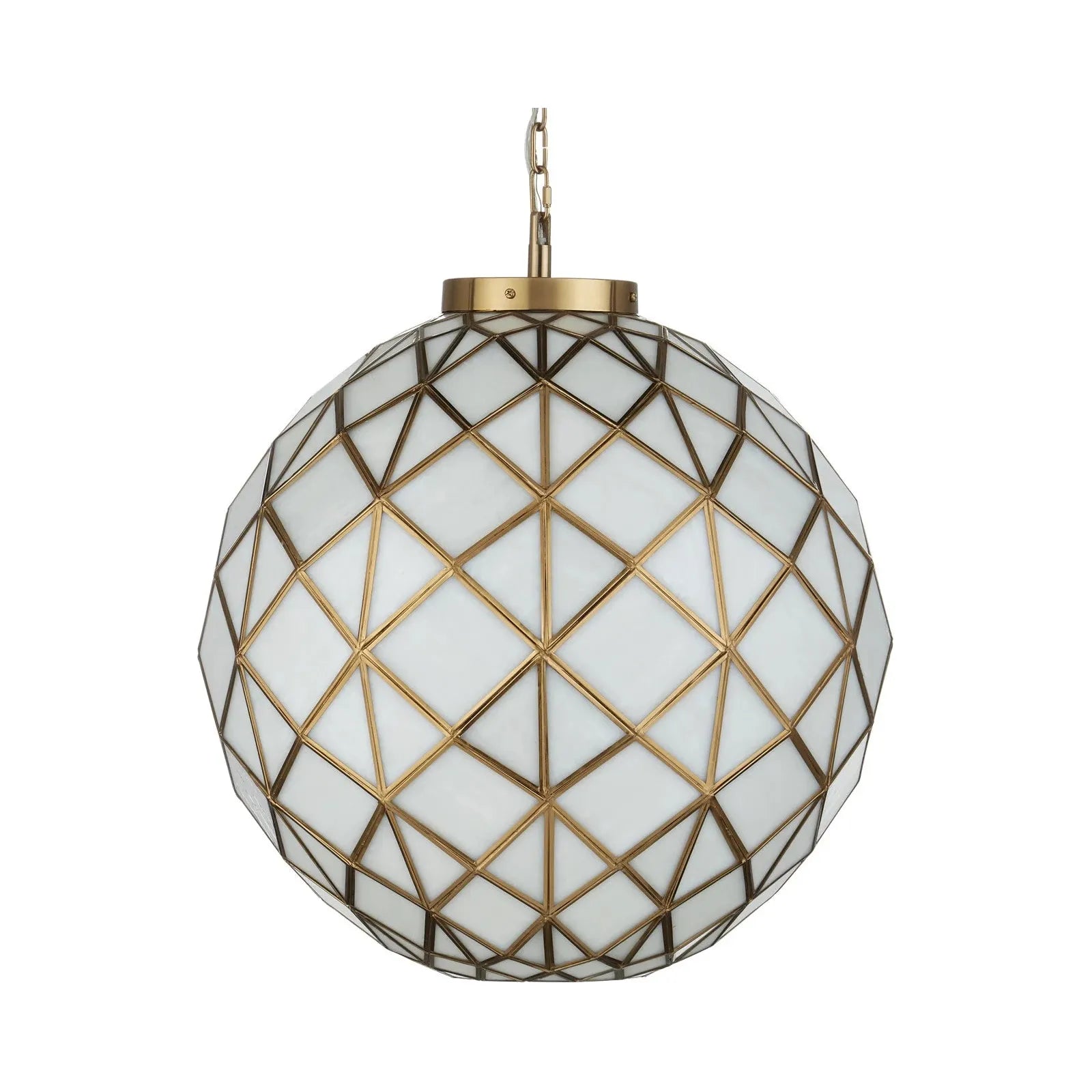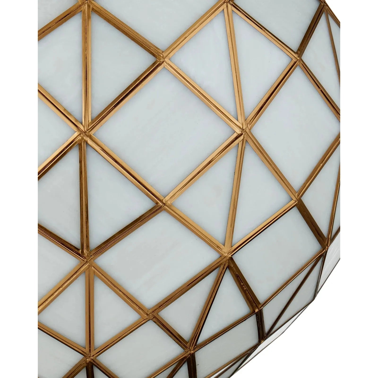 The Ashfield Pendant beautifully blends geometric precision with timeless elegance. Its triangular panes of white glass are meticulously pieced together between antique brass delineations, creating a captivating visual effect. When illuminated, the pendant’s glass takes on a subtle variation in hue, with milky white accents adding texture and depth to the fixture’s striking form.
