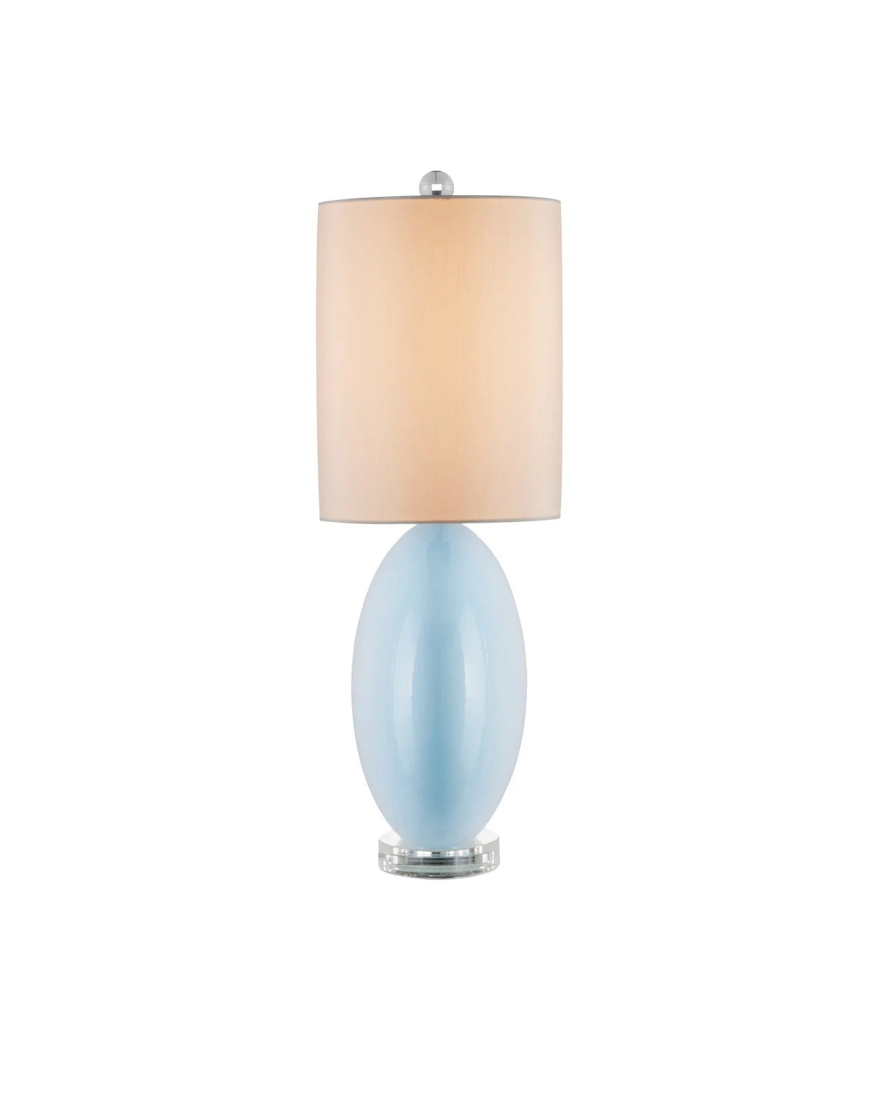 The Avalon Table Lamp brings a refined glow to consoles, bedside tables, and cabinetry with its sculptural light blue glass body and crystal accents. Narrow in profile yet rich in detail, it offers an elegant solution for spaces where visual interest is desired without overwhelming the surface. The polished nickel hardware and optic crystal base add a subtle touch of sophistication, making it a natural fit for classic and transitional interiors.