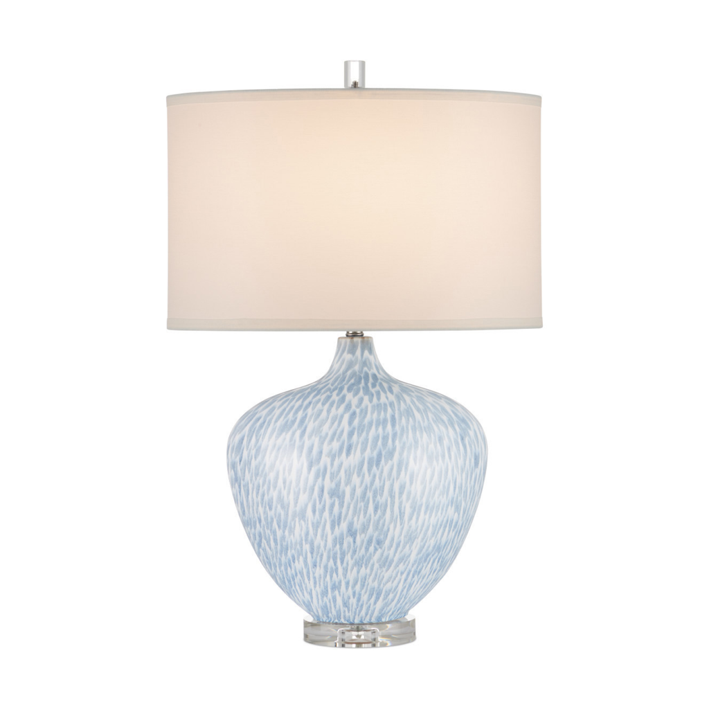 The Tinney Blue Table Lamp is a graceful heart-shaped design with a feminine oval profile, crafted from ceramic and finished in soft blue brushstrokes that mimic flowing plumes. Its artisan glazing creates subtle depth and variation, while the optic crystal base and matching finial add a refined, polished touch. The white linen oval shade enhances the airy silhouette, making it both elegant and versatile.