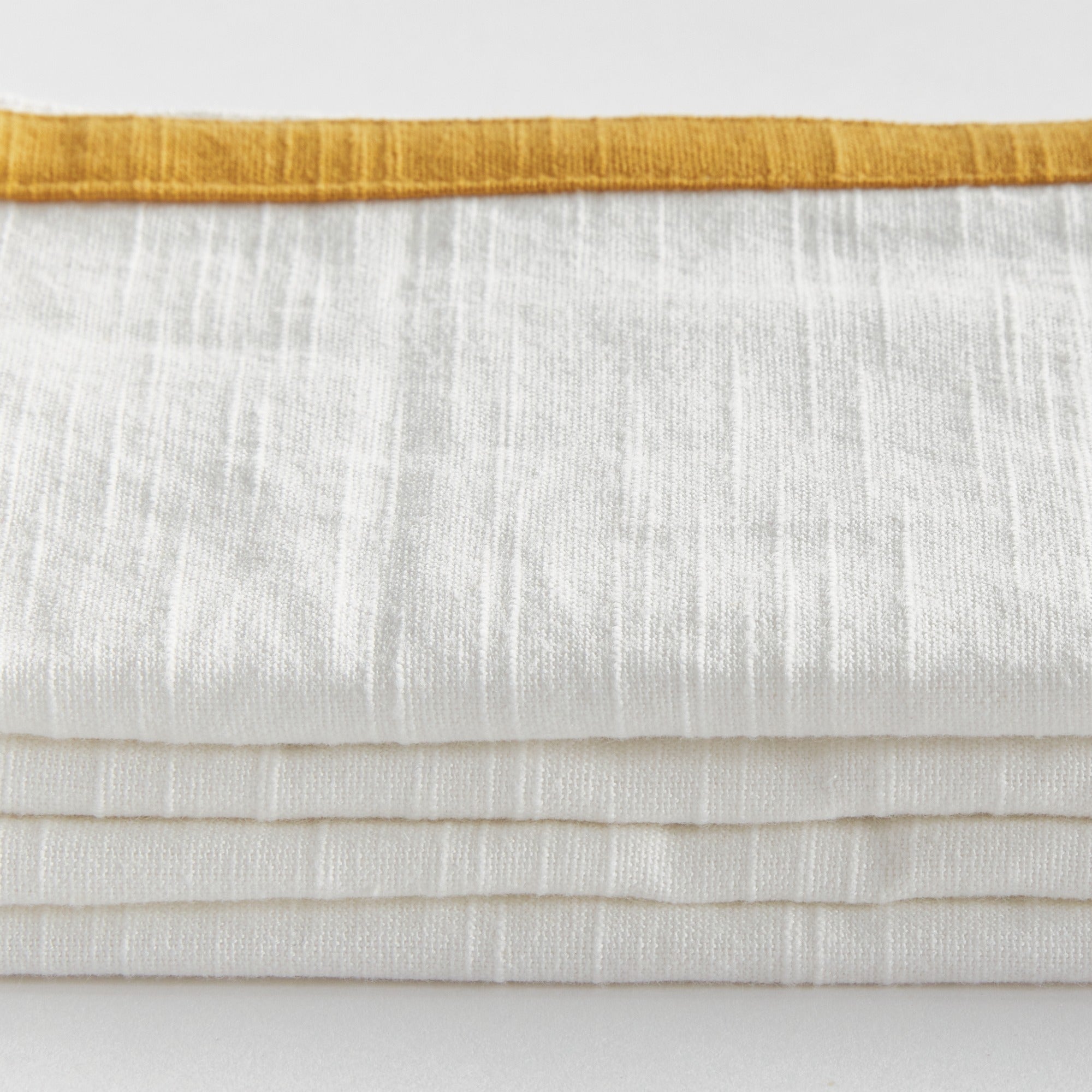 Crisp and classic, the Connor Dinner Napkins add a tailored touch to the table. Crafted from 100% woven cotton in soft white, each napkin is finished with an ochre-hued border that adds just the right amount of color and contrast. Tied neatly with grosgrain ribbon, this elegant set makes a thoughtful hostess gift or an elevated everyday staple.