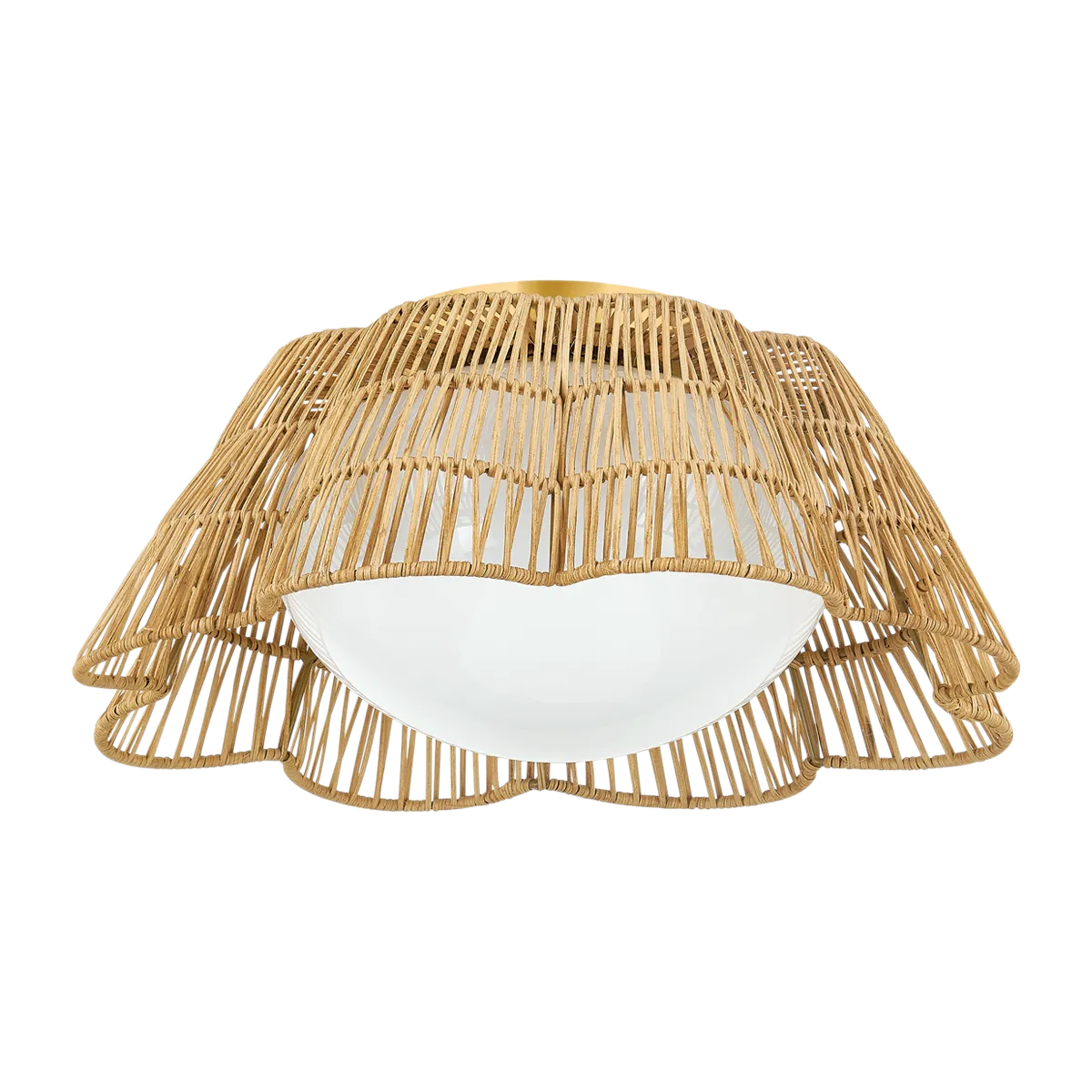 The Lowell Weave Flush Mount is a coastal flush mount that looks handmade because it is — a softly scalloped handwoven rattan shade over an opal glass globe, finished with an aged brass canopy. Light filters through the open weave and the globe beneath simultaneously, creating a warm, layered glow that a solid shade simply can't produce.
