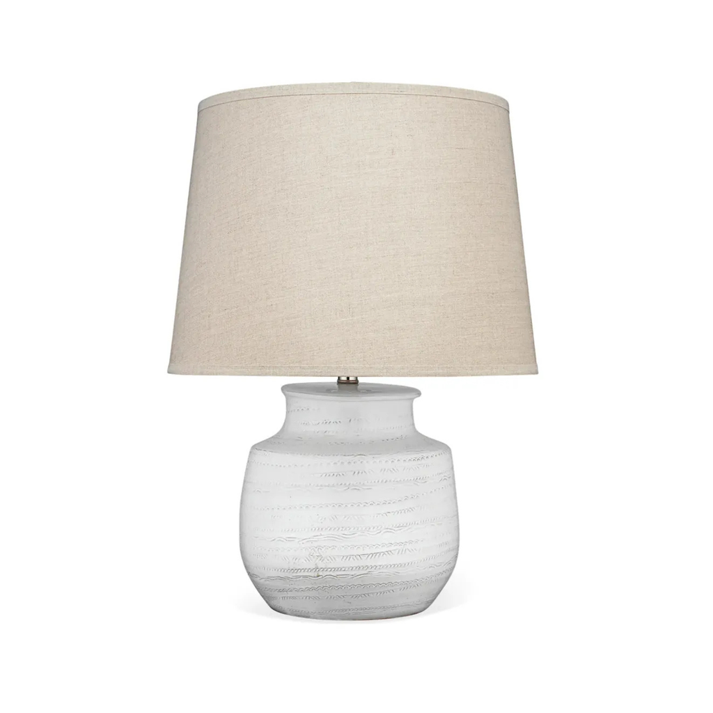 The Arden Table Lamp brings a quiet sense of texture and balance to a room with its etched white ceramic base and softly sculptural form. Subtle linear detailing traced around the body adds depth and visual interest while maintaining a calm, refined presence that feels timeless rather than decorative.