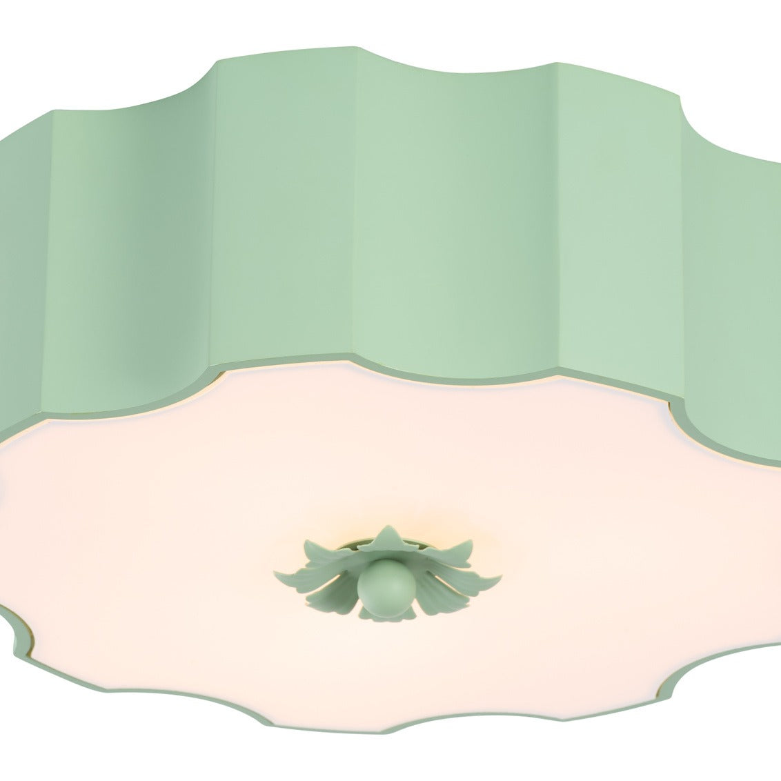 Add a touch of playful sophistication to your ceiling with the Fancy Wiggly Flush Mount — a collaboration between Amanda Lindroth and Chelsea House. Its sculptural metal shade features a charming wavy silhouette, finished in a fresh painted green that brings character and dimension to any room. A frosted glass diffuser softens the light, casting a warm, inviting glow, while the decorative finial adds a thoughtful touch. Perfect for bedrooms, entryways, or cozy reading corners, this design balances whimsy with timeless island elegance.