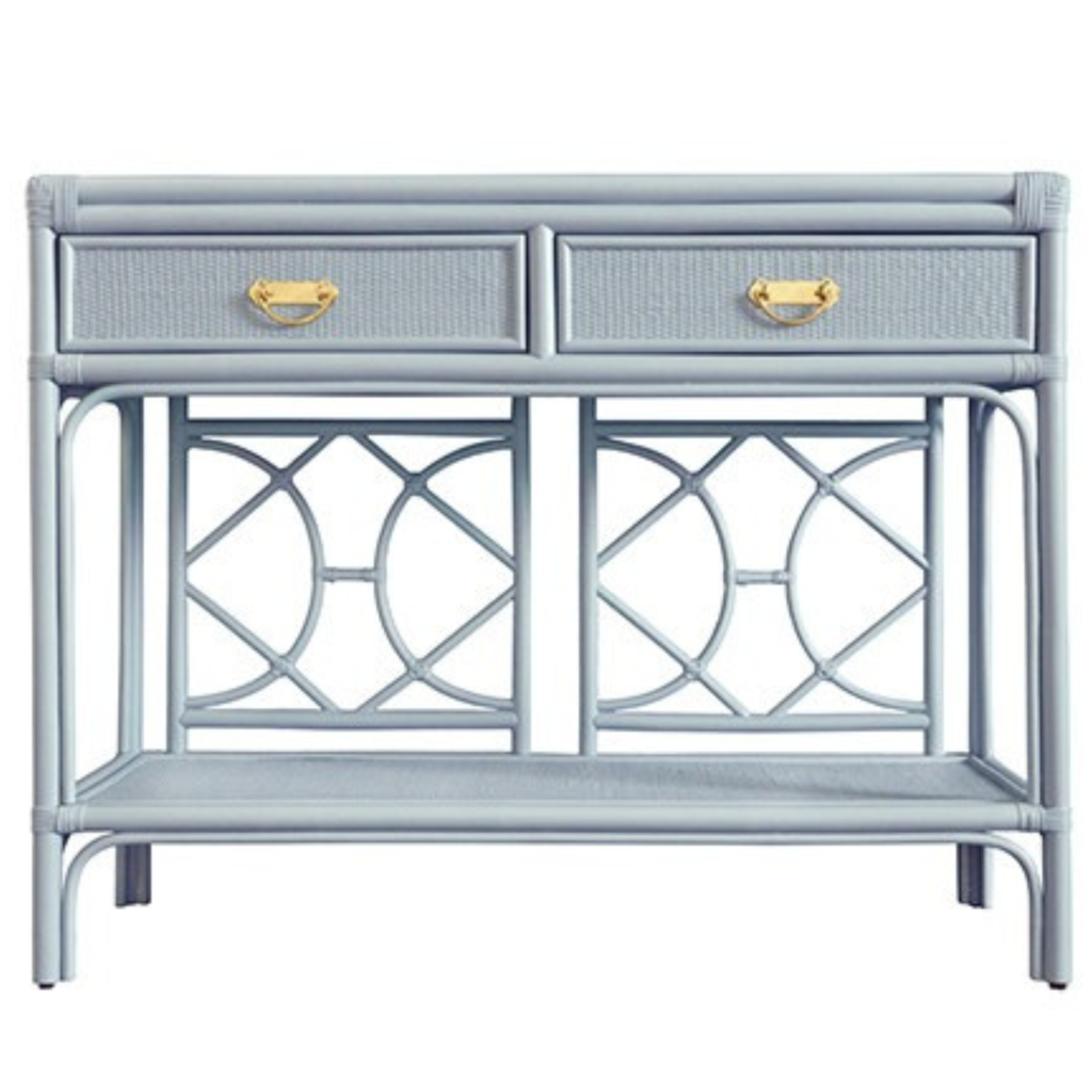 A fresh take on classic coastal furniture, the Harborview Console Table in Nantucket blue offers a soft wash of color while maintaining timeless structure. The painted rattan finish feels collected and unexpected, making it an ideal accent piece for entryways and living spaces.