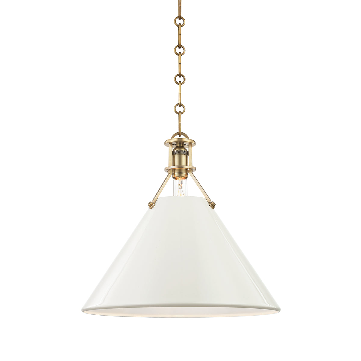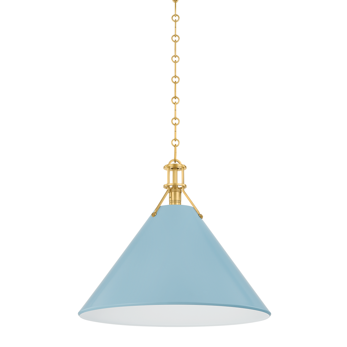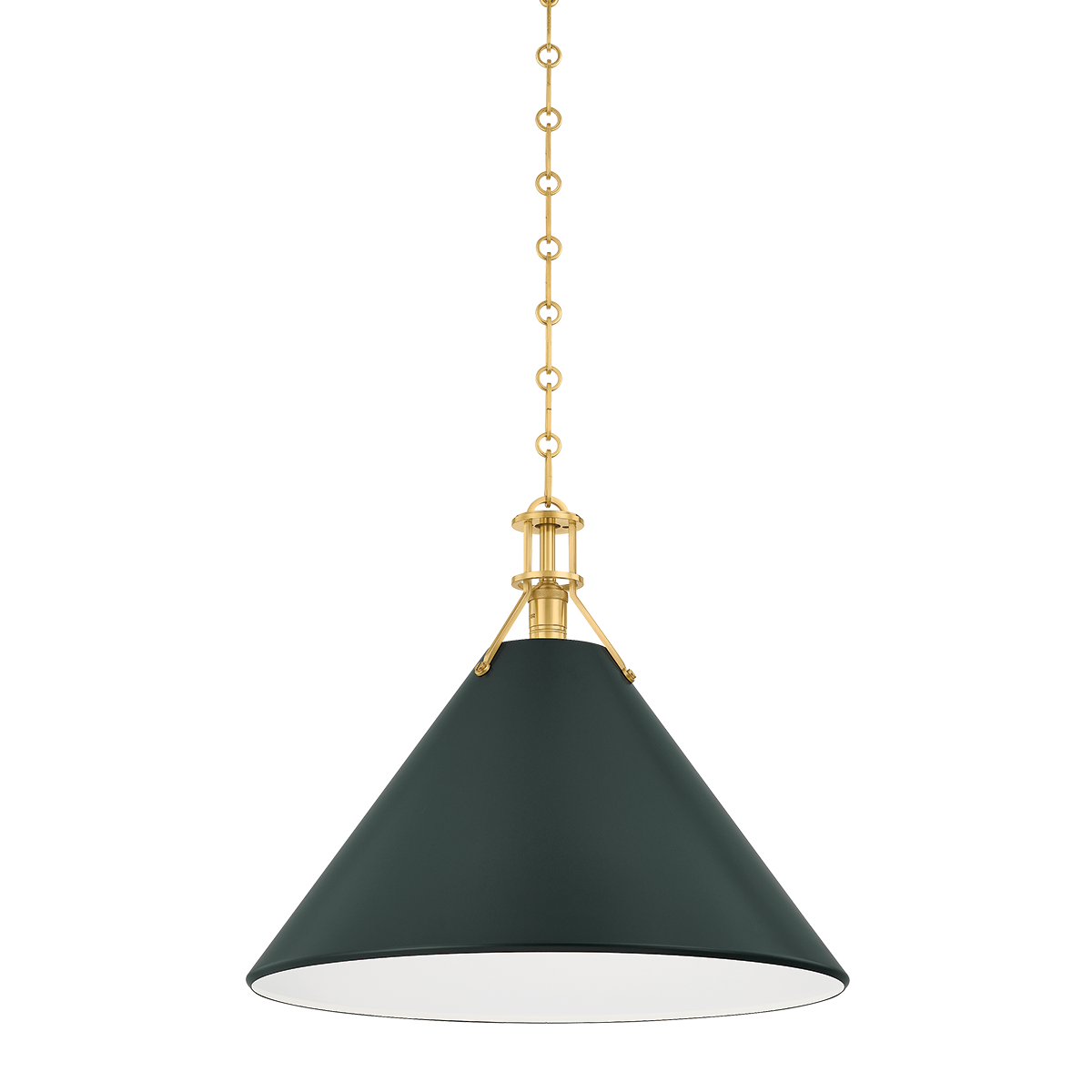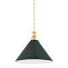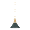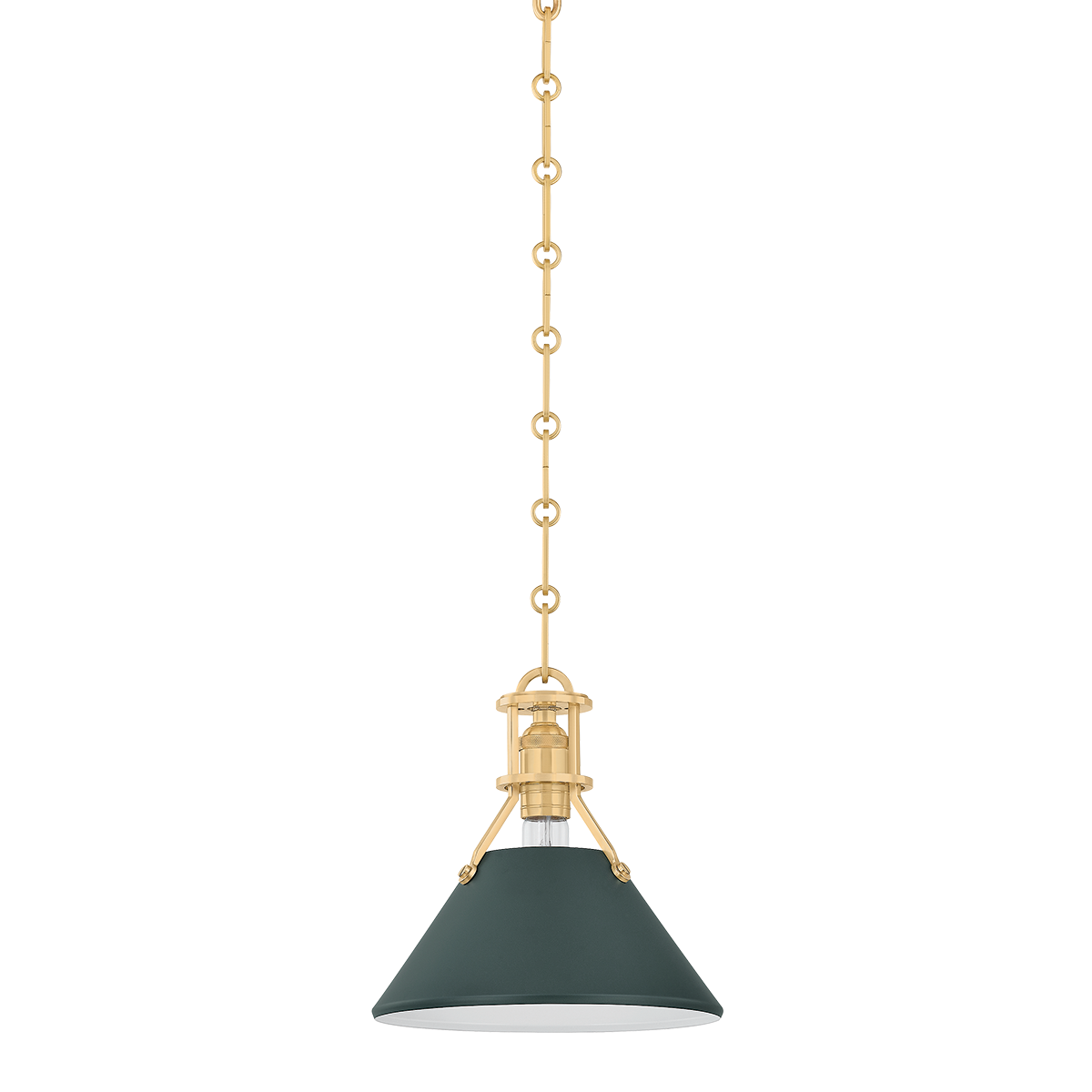 The Painted No. 2 Pendant brings a relaxed, time-honored elegance to kitchens, breakfast nooks, and dining spaces. Its gently tapered metal shade and classic chain suspension feel familiar yet refined, offering a look that is both tailored and inviting. Finished in aged brass with a soft studio green exterior, it adds depth and warmth without feeling heavy or formal.
