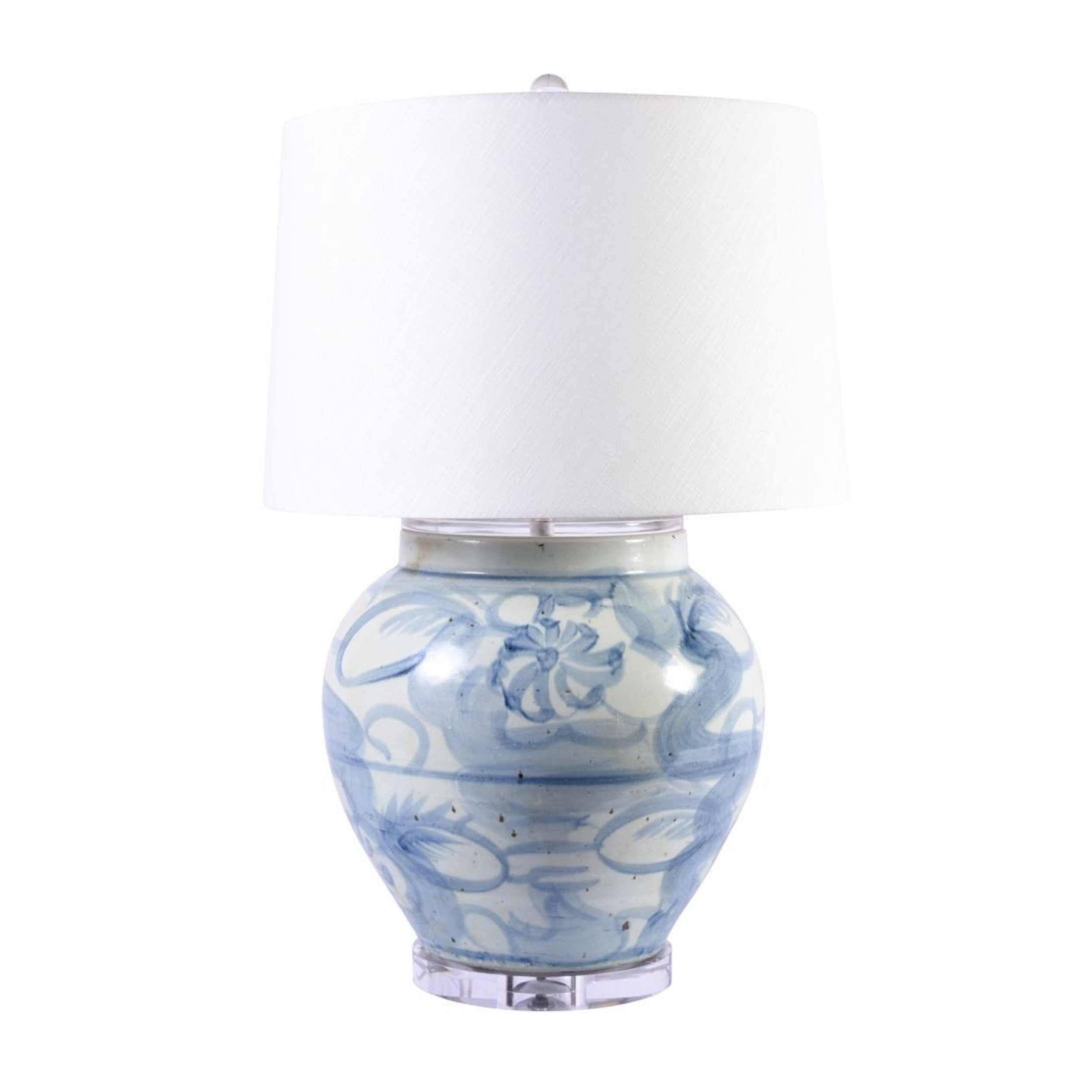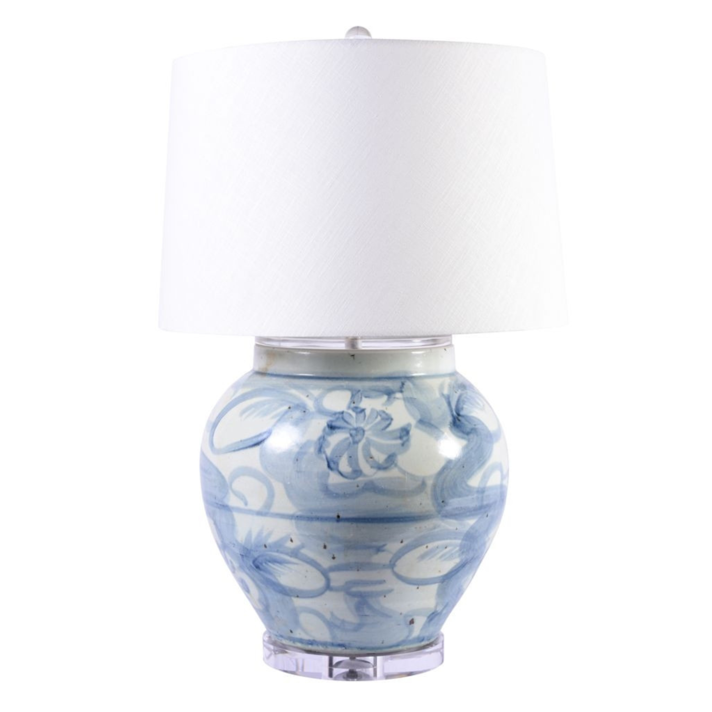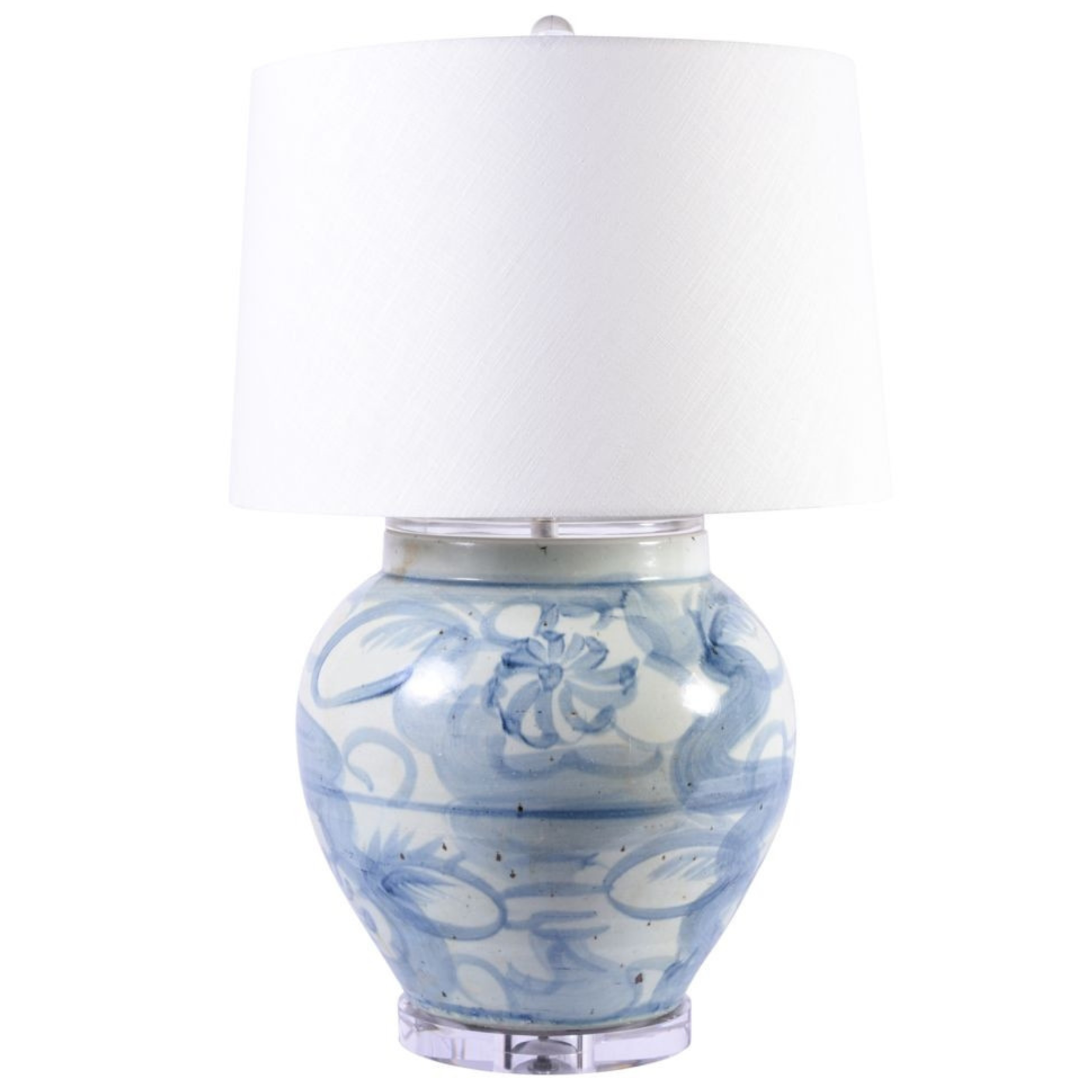 The Tisbury Table Lamp brings timeless blue and white style into the home with a soft, painterly porcelain base and a classic rounded silhouette. Hand-painted with flowing floral motifs, each piece features subtle variations that give it depth, character, and an unmistakably collected feel. The clear acrylic base and crisp white shade keep the look light and tailored.