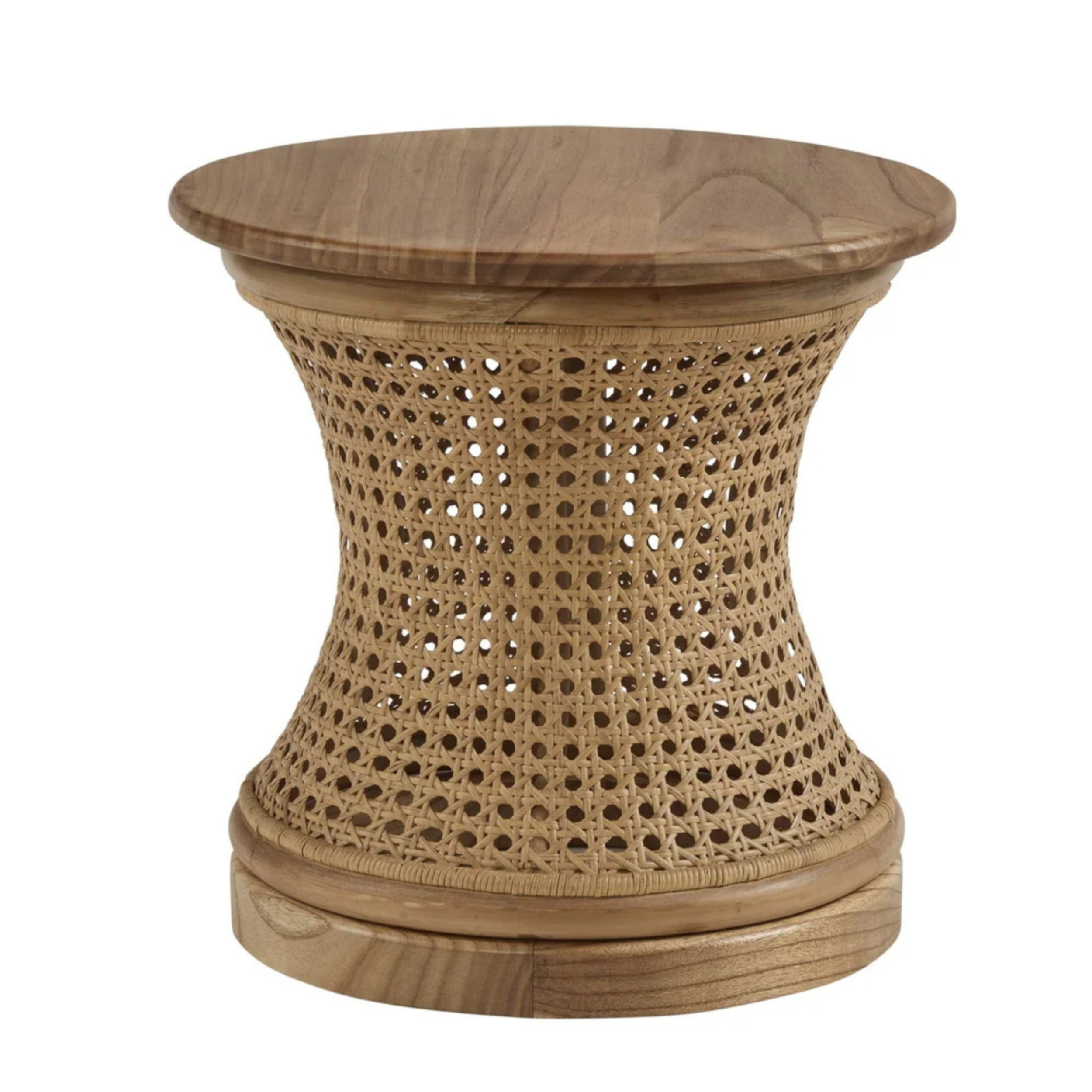- Material: Natural wood top with woven cane base