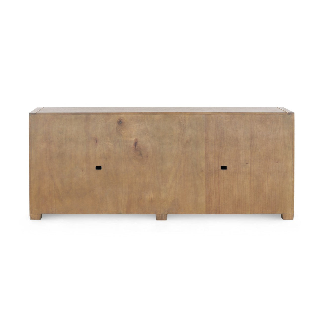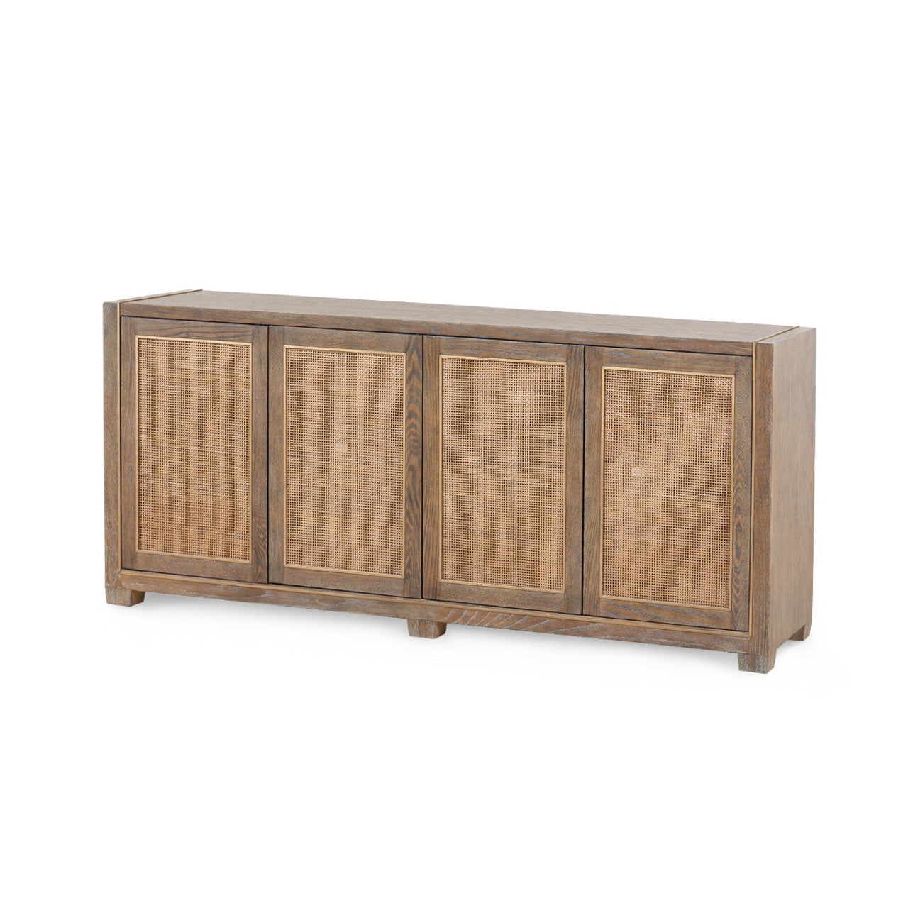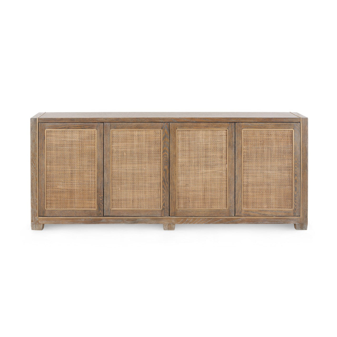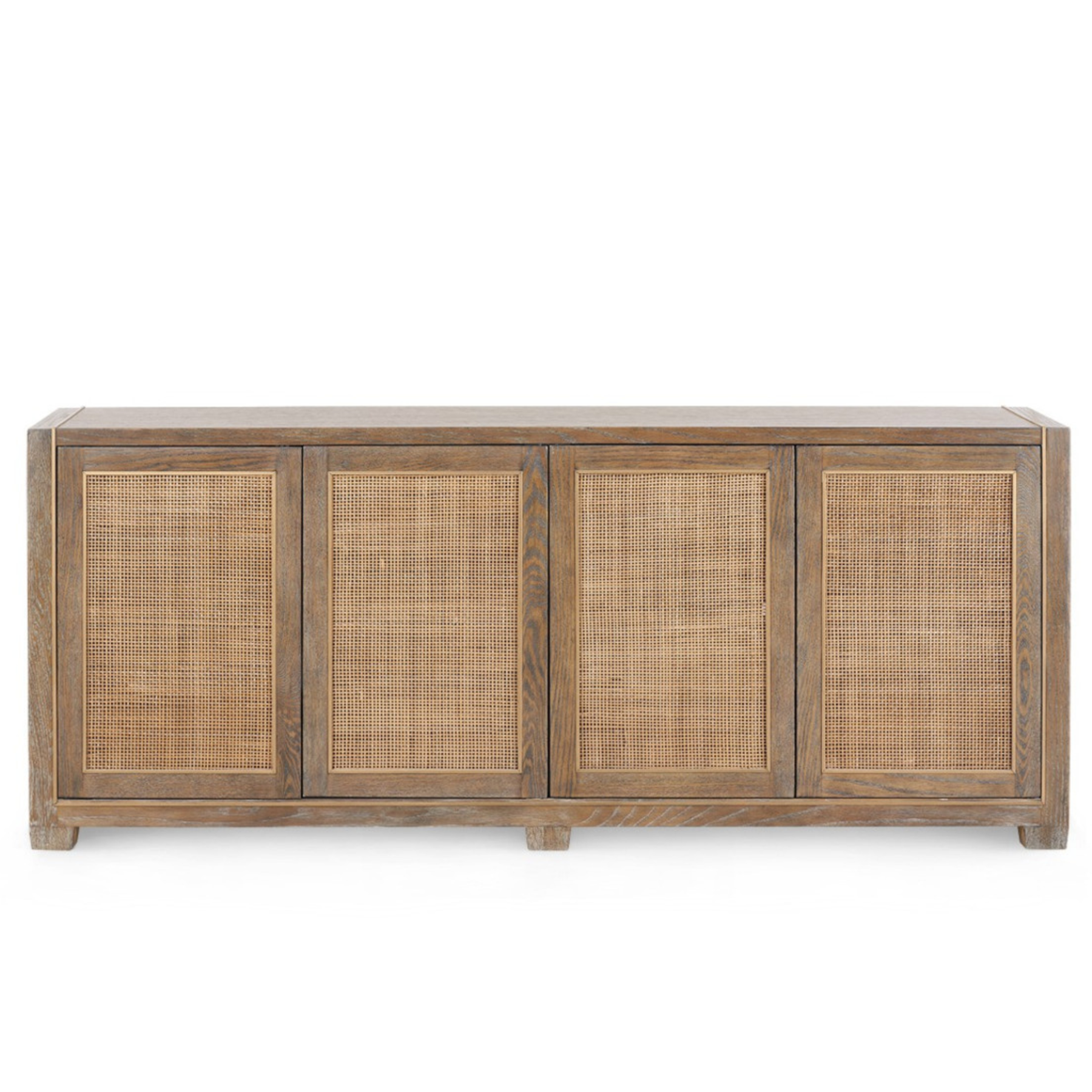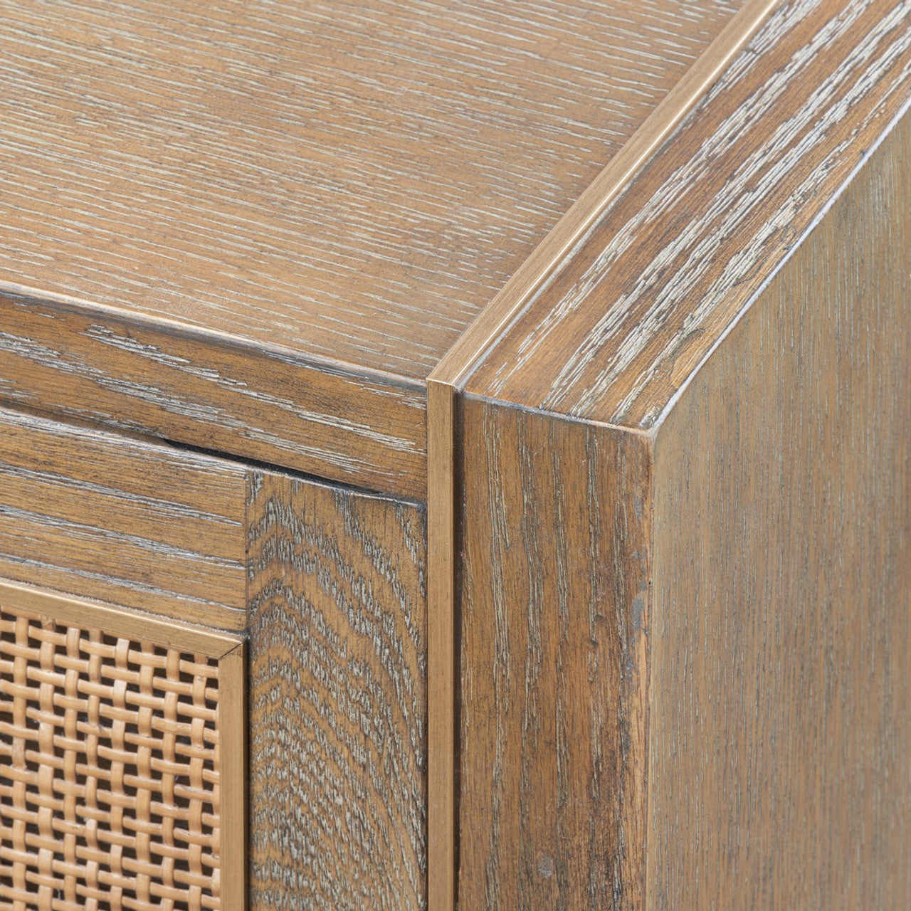 The Carrington Sideboard is bleached cerused oak veneer with handwoven cane panels framed in satin bronze — a 62" wide dining room or living room piece where natural texture meets refined hardware. The cane panels bring warmth and coastal character to the cerused oak, and the satin bronze frames add a quiet architectural detail that elevates the whole piece. Nine soft-close drawers with veneered interiors provide organized storage with the kind of interior finish quality that a daily-use sideboard deserves.