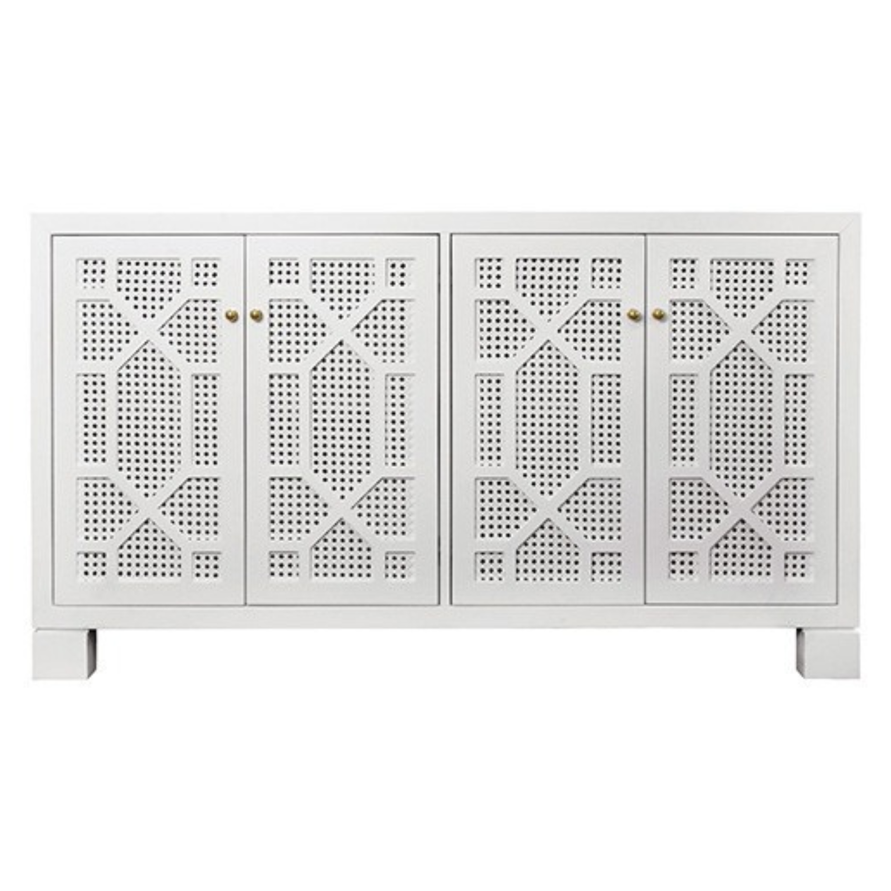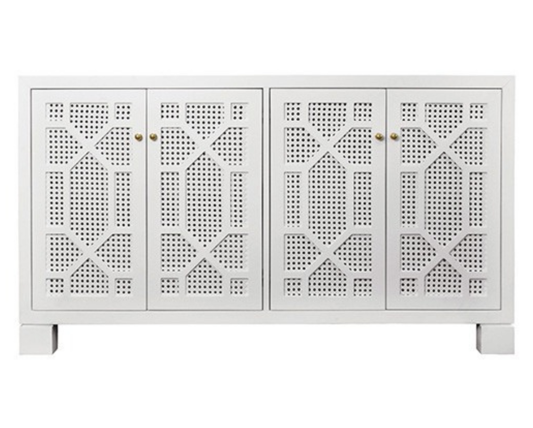 The Claire Sideboard in Matte White is a wood frame with painted cane door panels in a soft matte white finish — a 58" wide coastal sideboard with four doors and adjustable, removable interior shelving. The painted cane panels add natural texture and warmth that a solid white door would lack, and the four-door format provides generous, organized storage for a dining room, living room, or entertaining space. Also available in Navy.