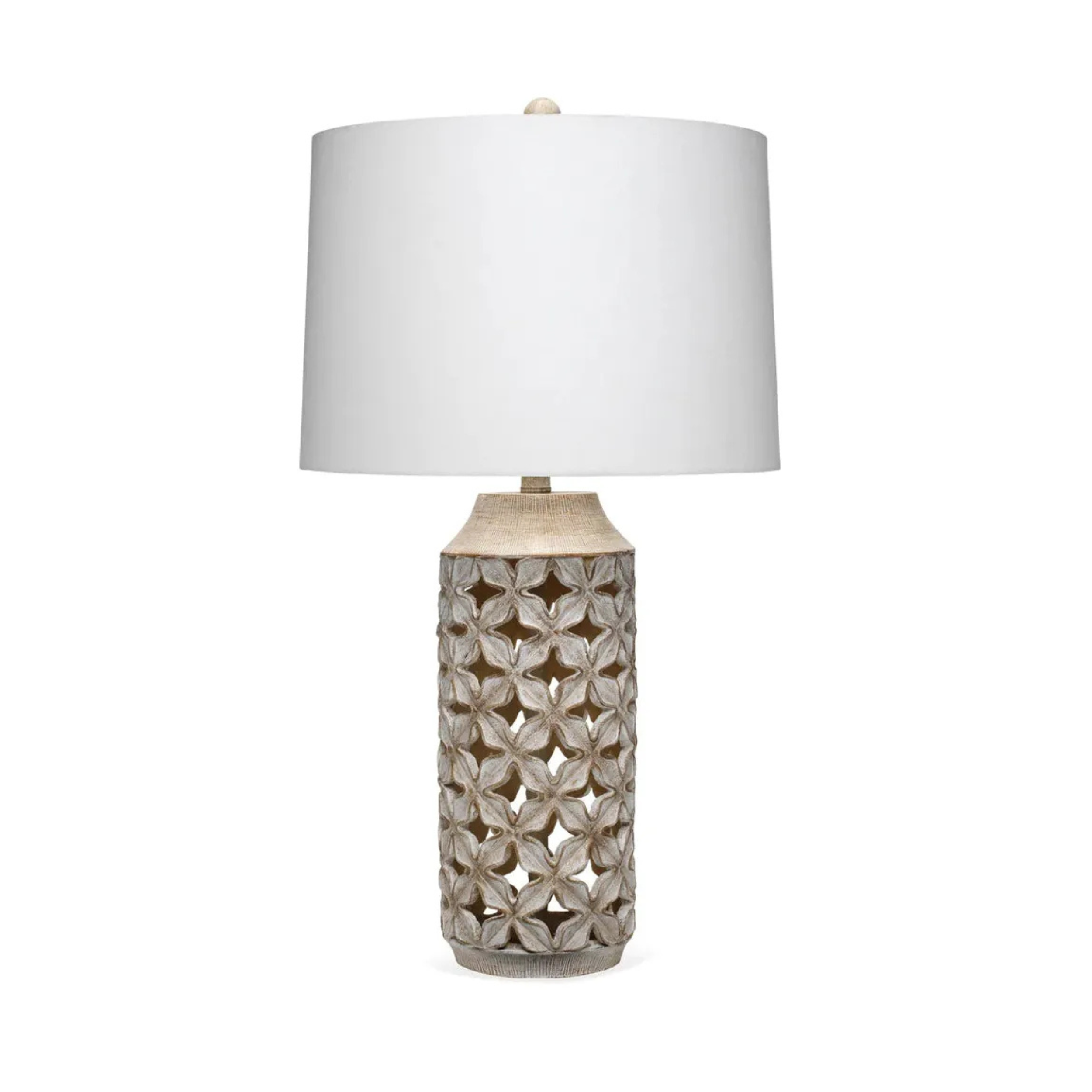 The Tilda Table Lamp brings sculptural texture and quiet elegance to a space with its intricately carved open lattice base. Inspired by classic floral motifs, the design feels decorative yet grounded, offering visual interest without overwhelming the room.