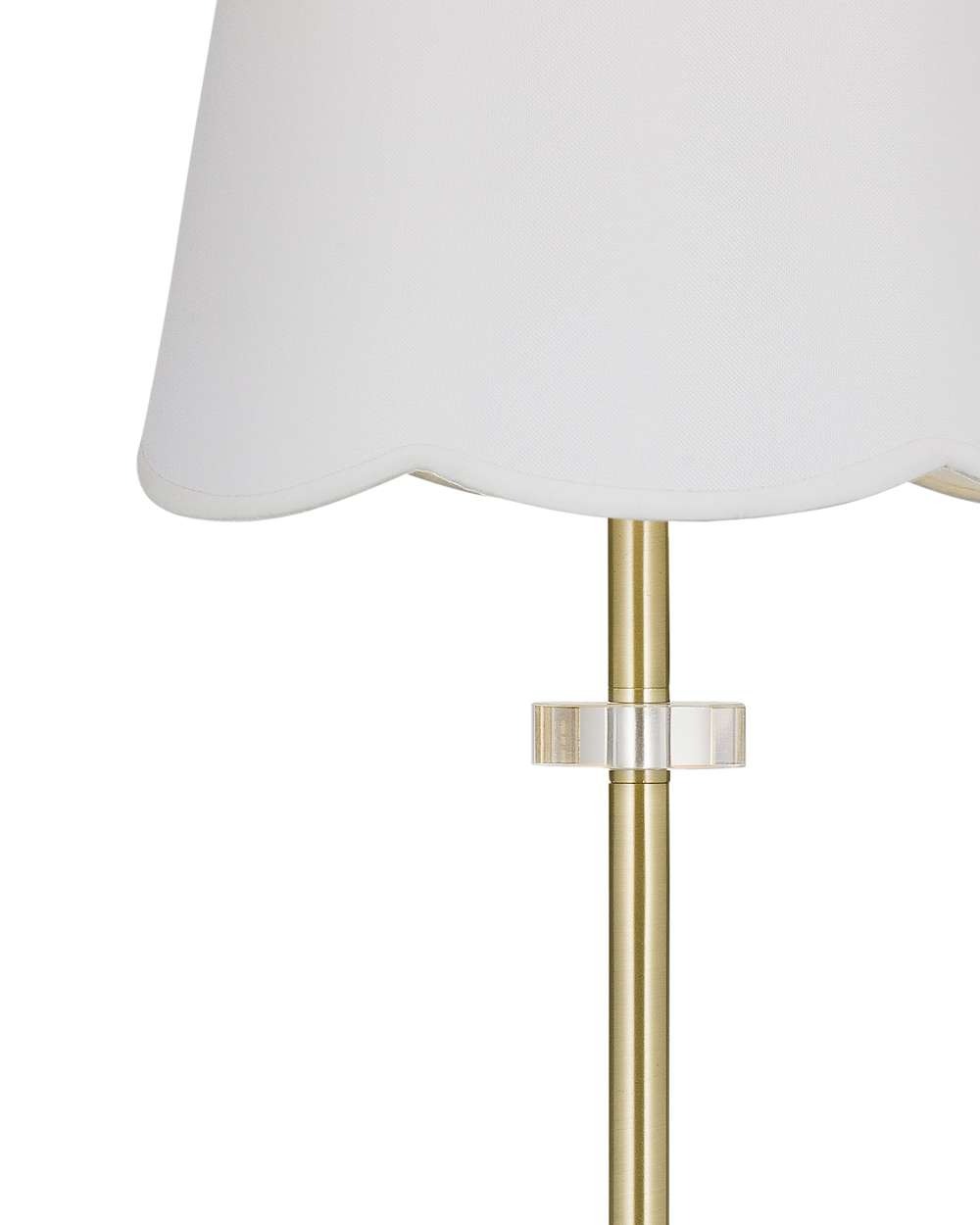 The Addison Table Lamp brings an elegant touch of glamour to any space with its slender gold stem and clear acrylic detailing. A scalloped white linen shade softens the silhouette, casting a warm, flattering light that feels both refined and inviting.
