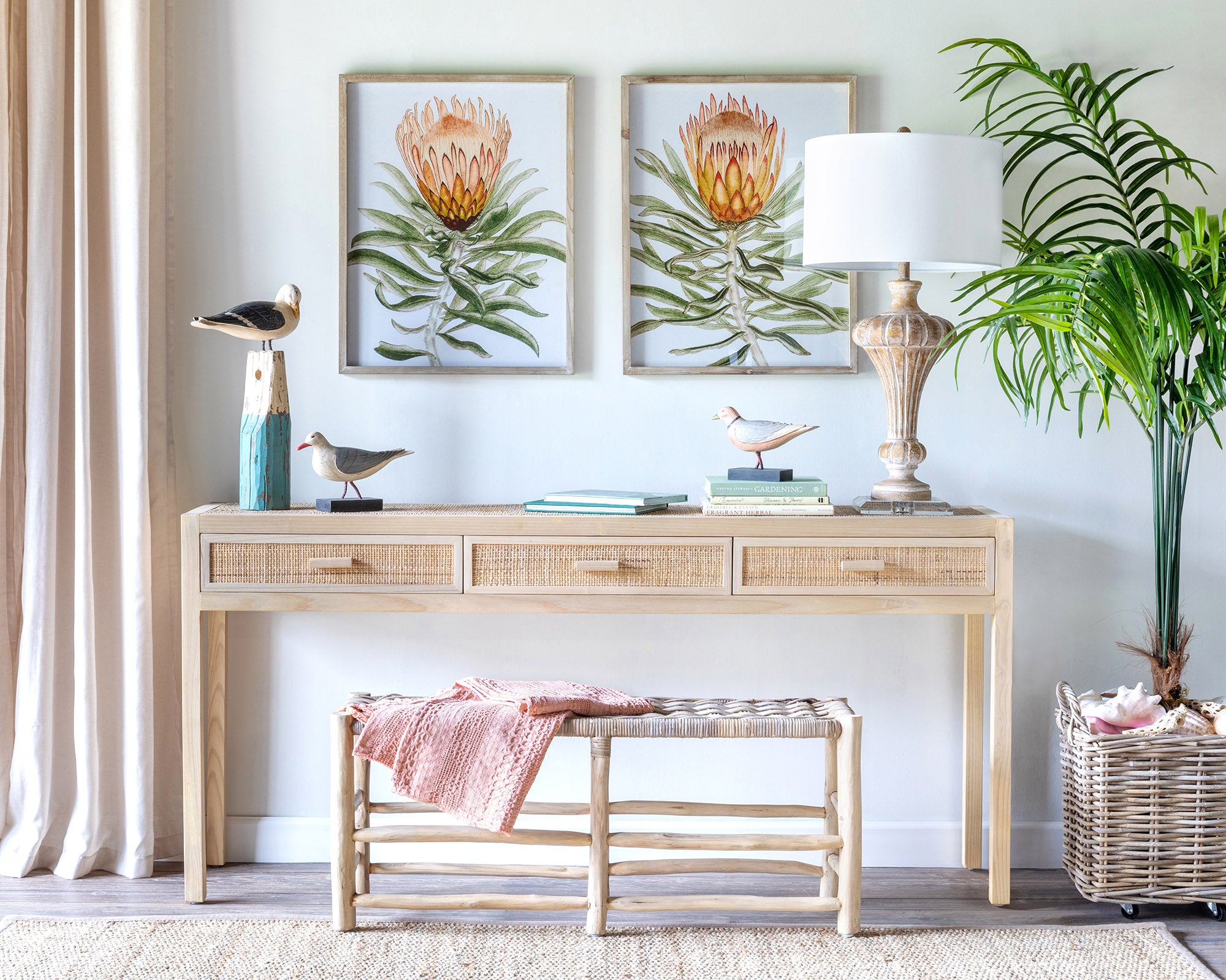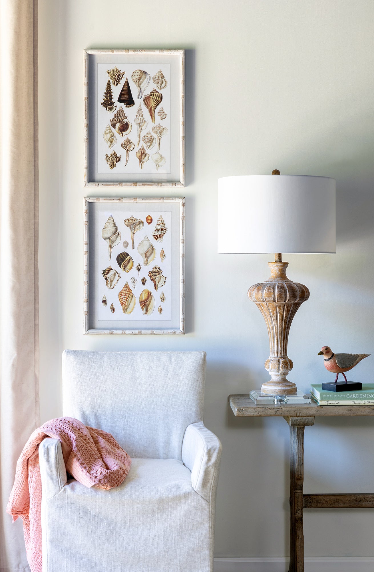 Finished with a five-step whitewash and paired with a crisp linen shade, the lamp offers both delicacy and presence. Outfitted with a three-way switch and five-foot cord, it accommodates a 100-watt bulb—perfect for bringing coastal-inspired elegance to bedside tables, consoles, or living spaces.