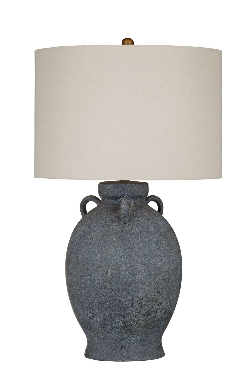 The Canongate Table Lamp blends modern traditional design with rich texture and timeless form. Its urn-shaped base, finished in deep charcoal gray, adds dimension and character while the subtle handles provide sculptural interest. A cream linen drum shade softens the look for a warm, balanced glow.