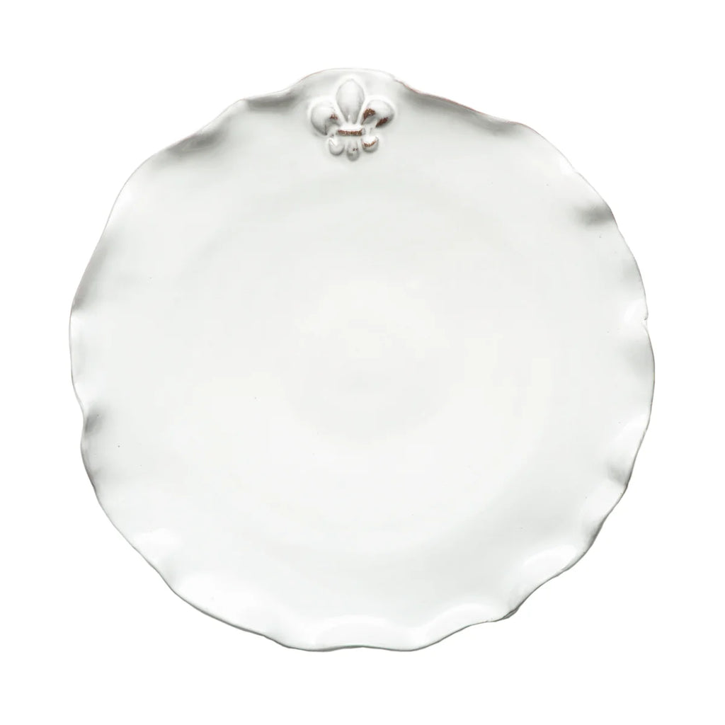 Bring timeless European charm to your table with the Fleur de Lis Dinner Plate. Handcrafted in Italy, each plate features a ruffled edge and a raised Fleur de Lis motif finished in a soft whitewashed glaze. Practical for everyday use yet beautiful enough for special occasions, it pairs effortlessly with other pieces in the Fleur de Lis Collection.