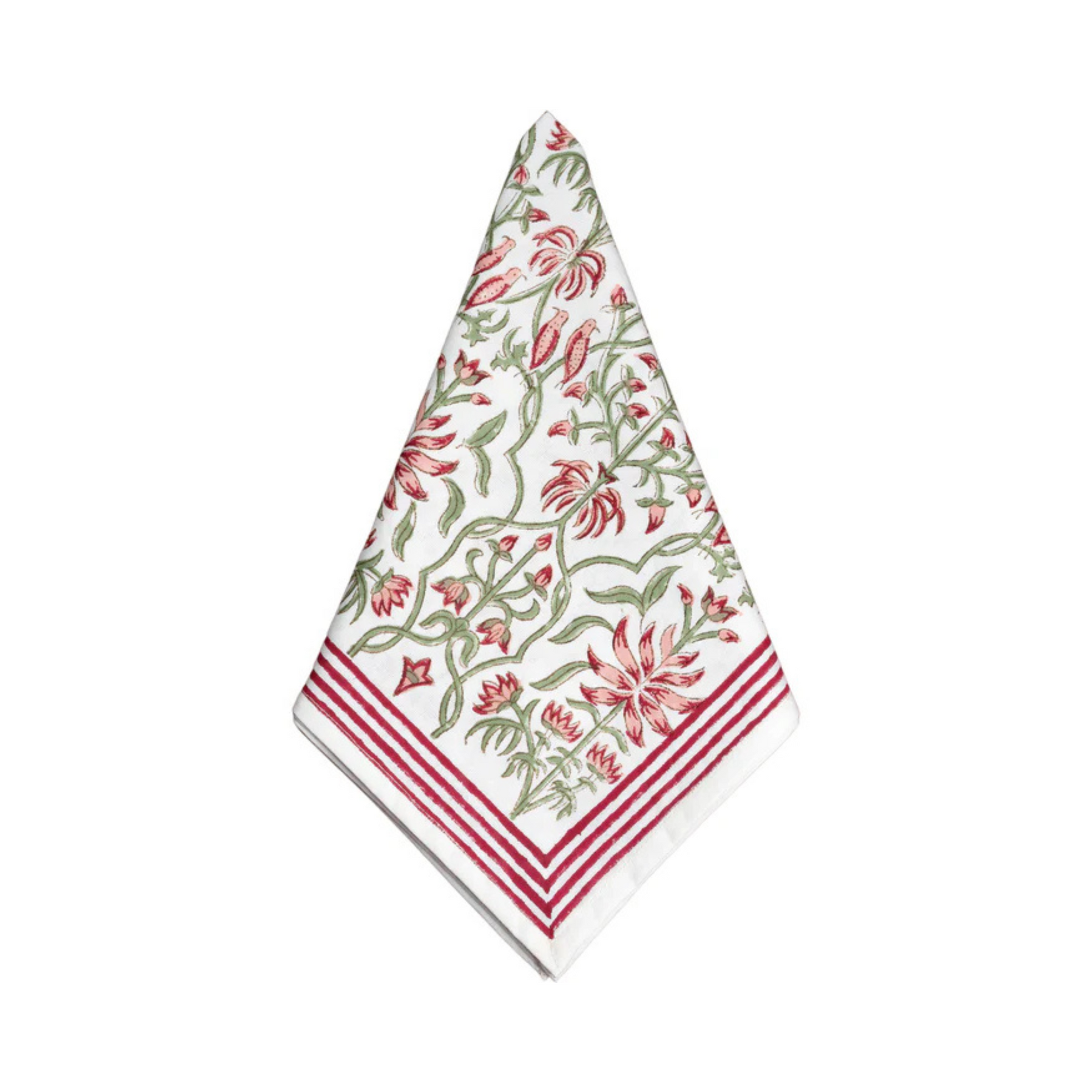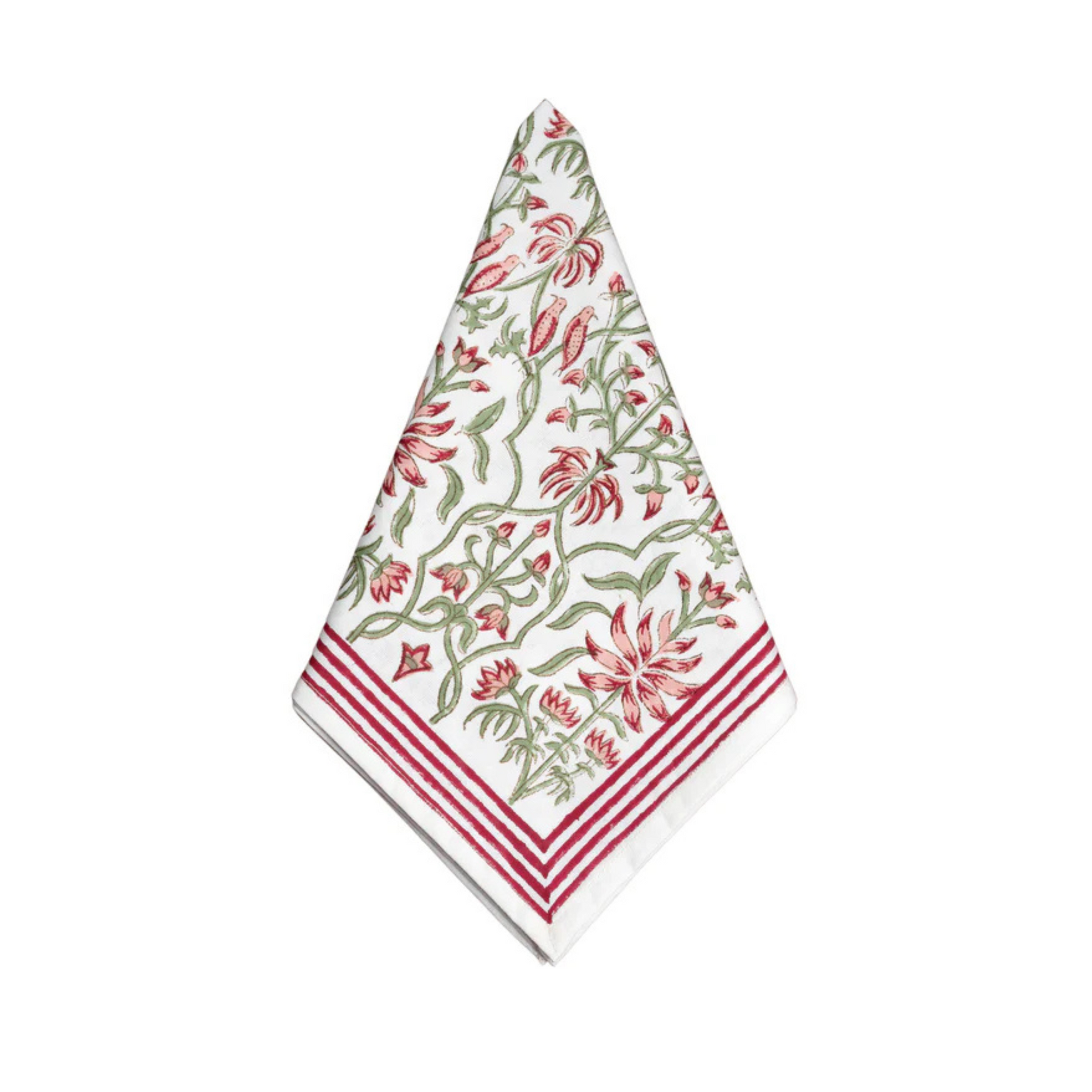 The Cabana Napkins in Le Jardin are 100% cotton hand block-printed using traditional techniques — a garden-inspired pattern that brings the warmth and beauty of a French potager to the dinner table. Le Jardin means 'the garden,' and that sense of a place that is tended and loved with care comes through in every flower, leaf, and vine in the pattern.