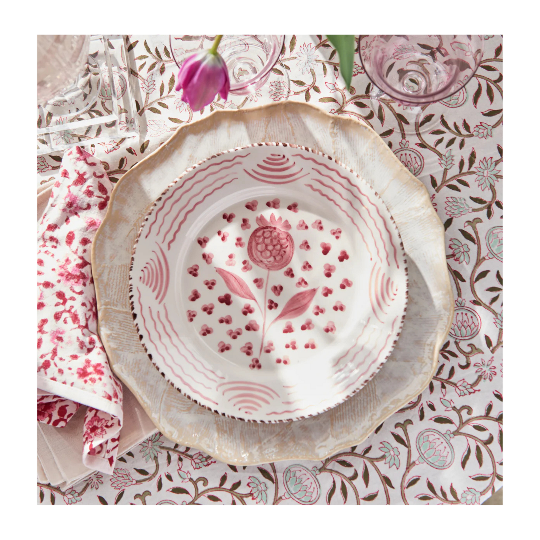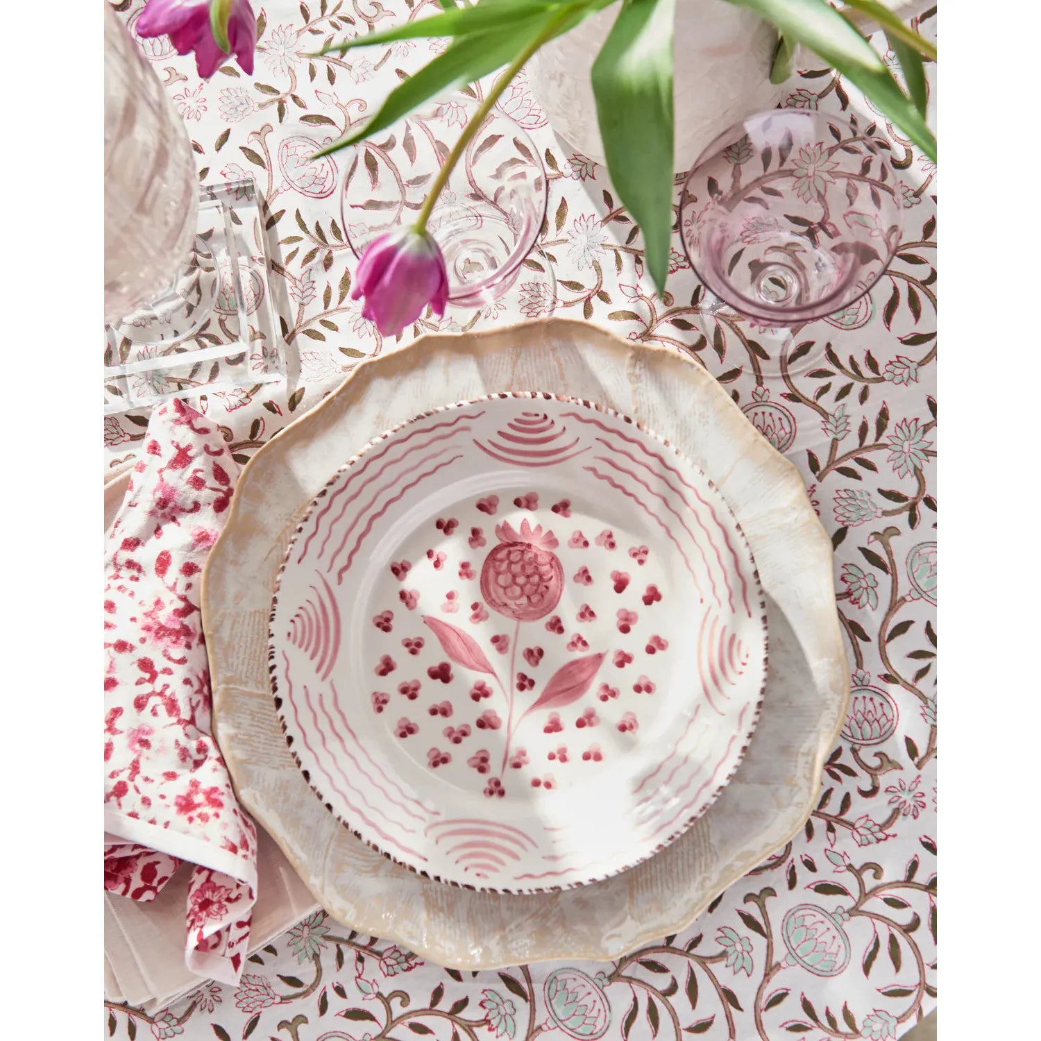 Hand painted ceramic dinner plates in a pink and white pomegranate and wave motif, designed to bring a collected, European feel to your table. Made in Portugal, this pattern draws inspiration from traditional Talavera-style ceramics while feeling fresh, layered, and easy to live with.