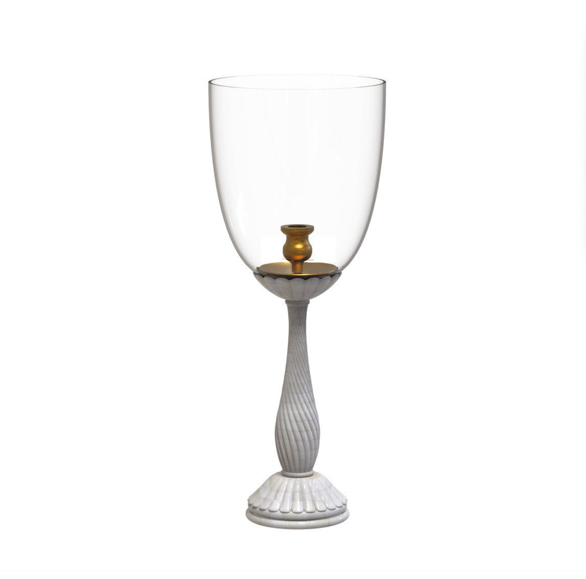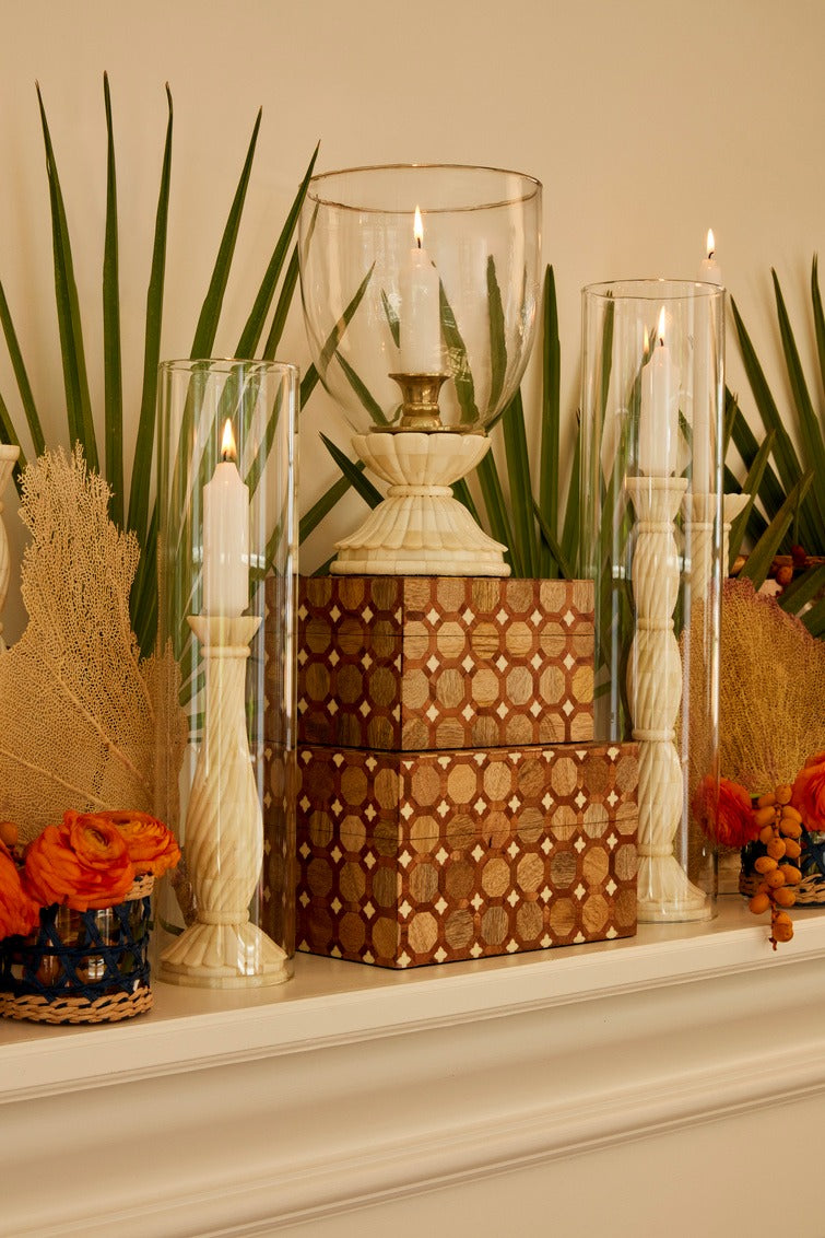The Beaumont Hurricane captures the elegance of classic English design with a sculptural presence that feels both refined and timeless. The pedestal base is hand-carved from natural bone in a gathered twist silhouette, paired with a solid brass candle holder and mouth-blown glass hurricane.
