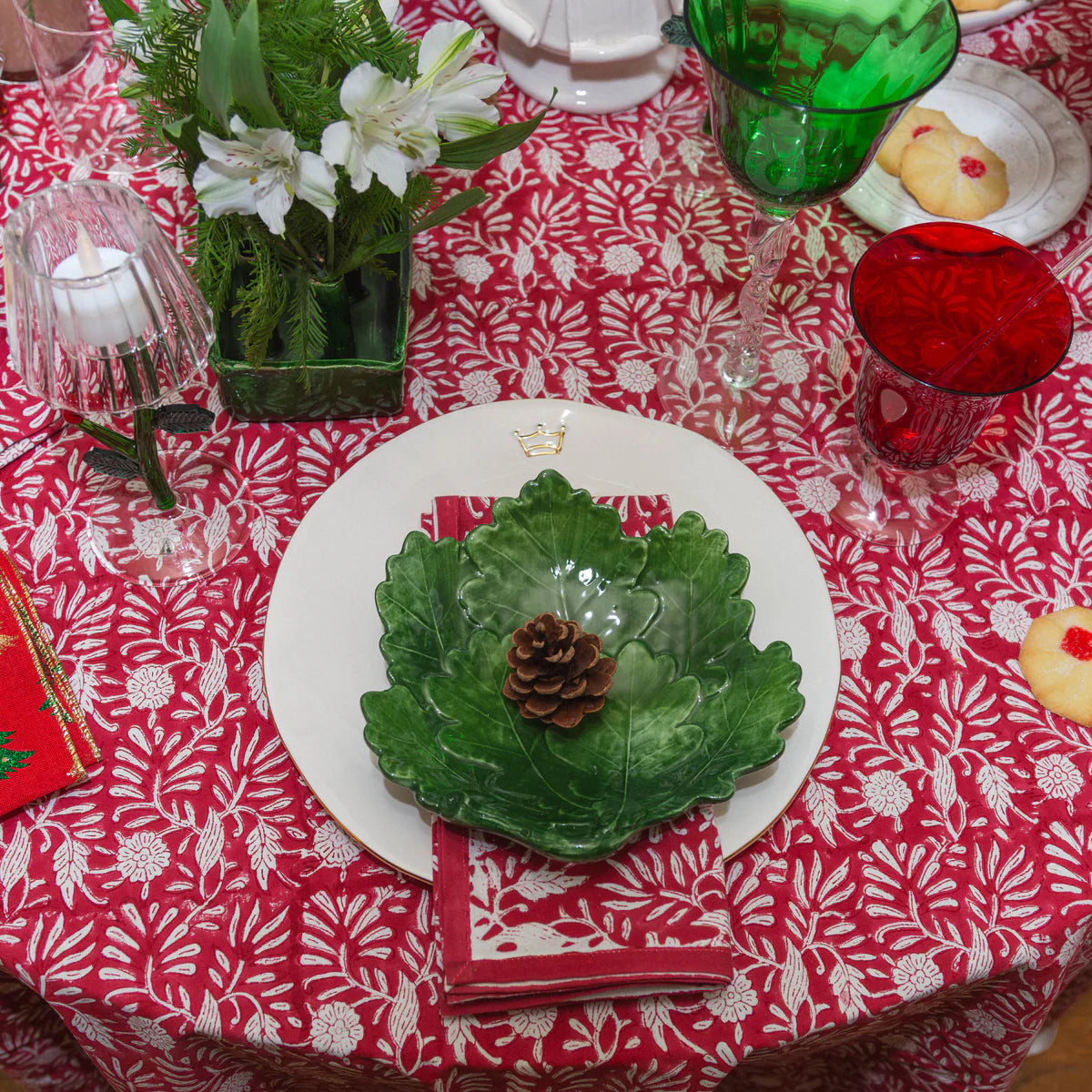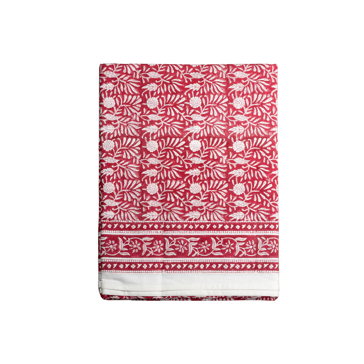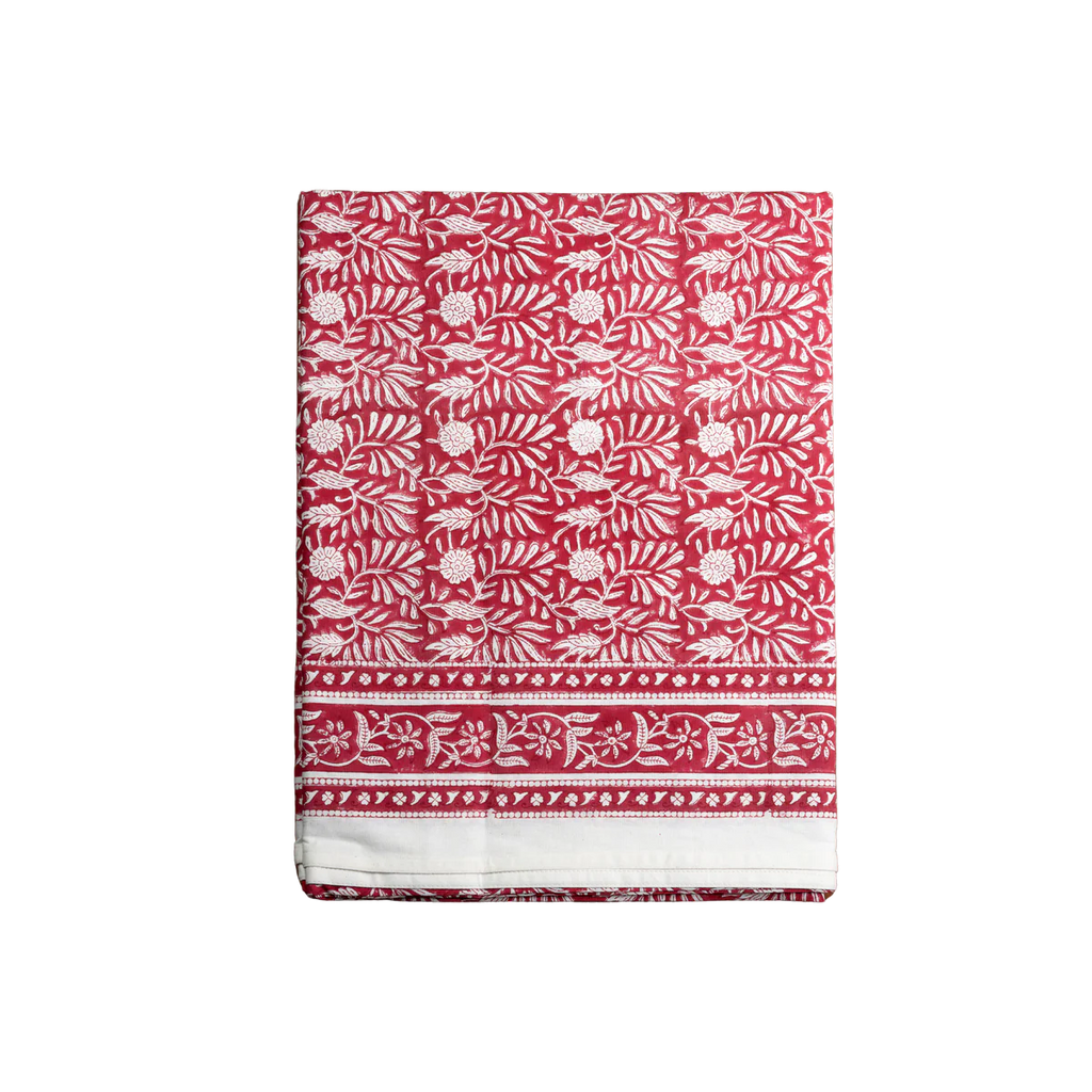 Bring warmth and pattern to your table with this hand-block printed cotton tablecloth in a vibrant red sunset palette. The floral and border motifs create a layered, welcoming look that feels equally at home for family dinners, holiday gatherings, or weekend entertaining. Its artisanal character adds charm and personality to any tablescape.