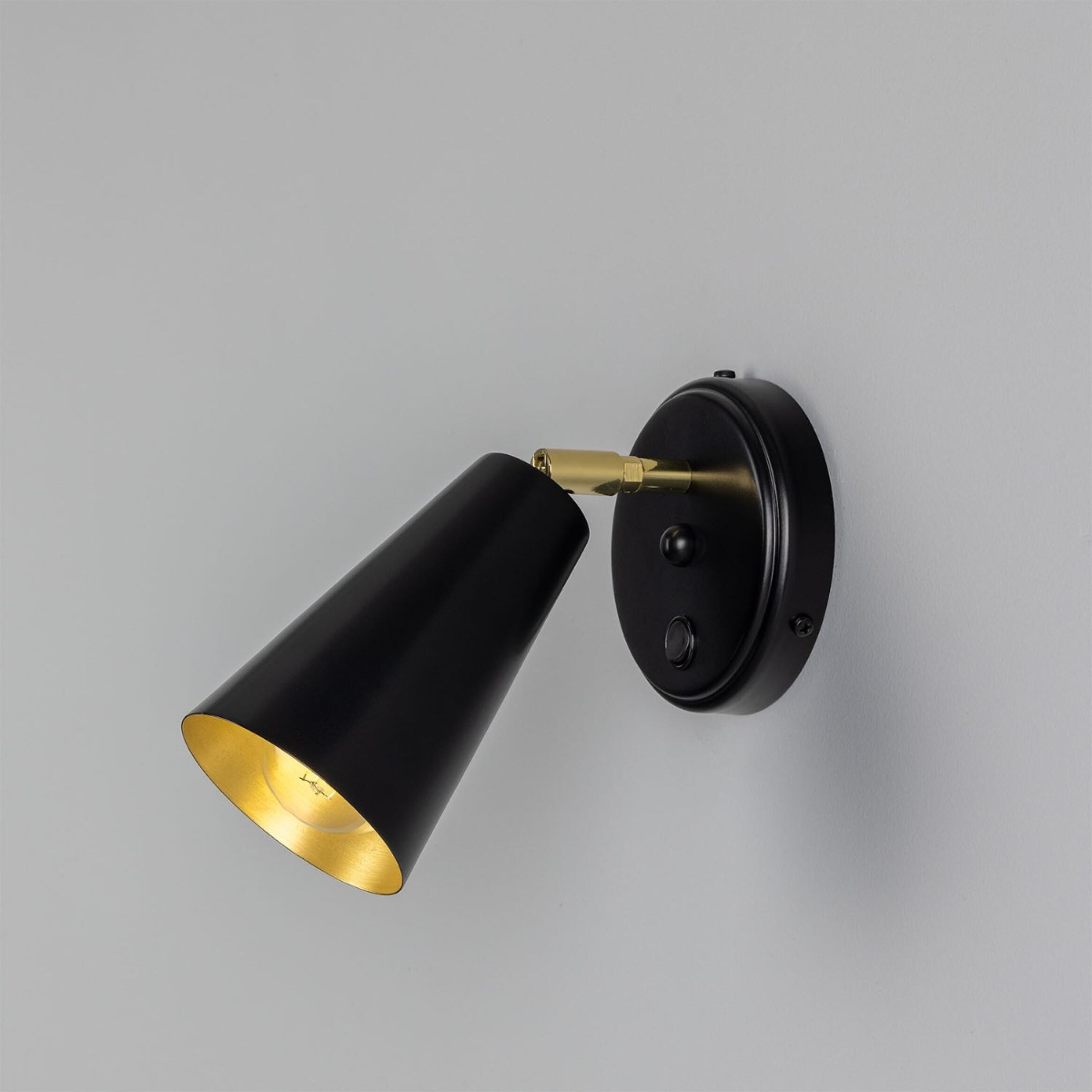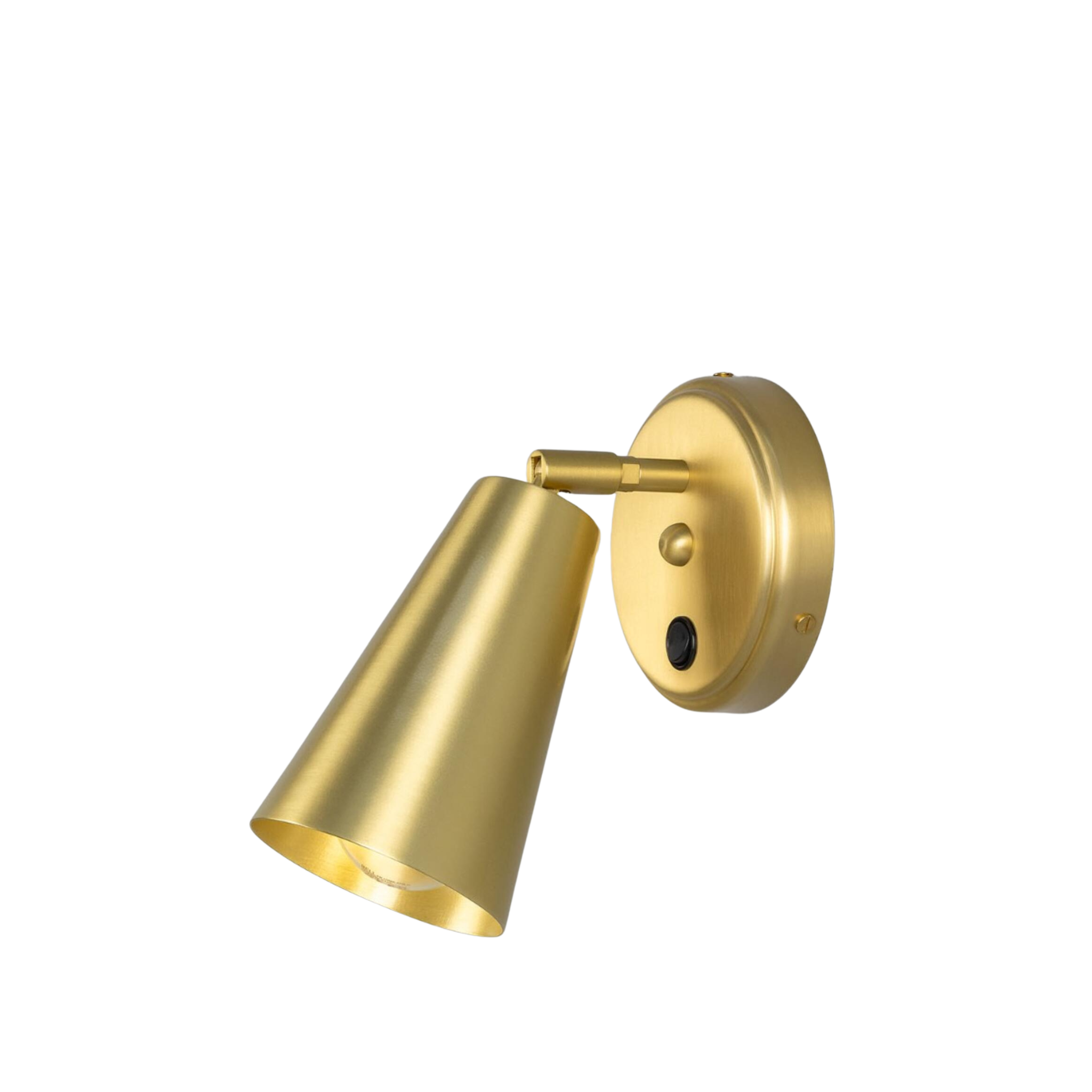 The Cashel Wall Sconce blends industrial functionality with timeless elegance. Its cone-shaped brass shade and built-in wall switch bring both beauty and practicality to the design, making it perfect for spaces that need refined lighting with everyday ease.