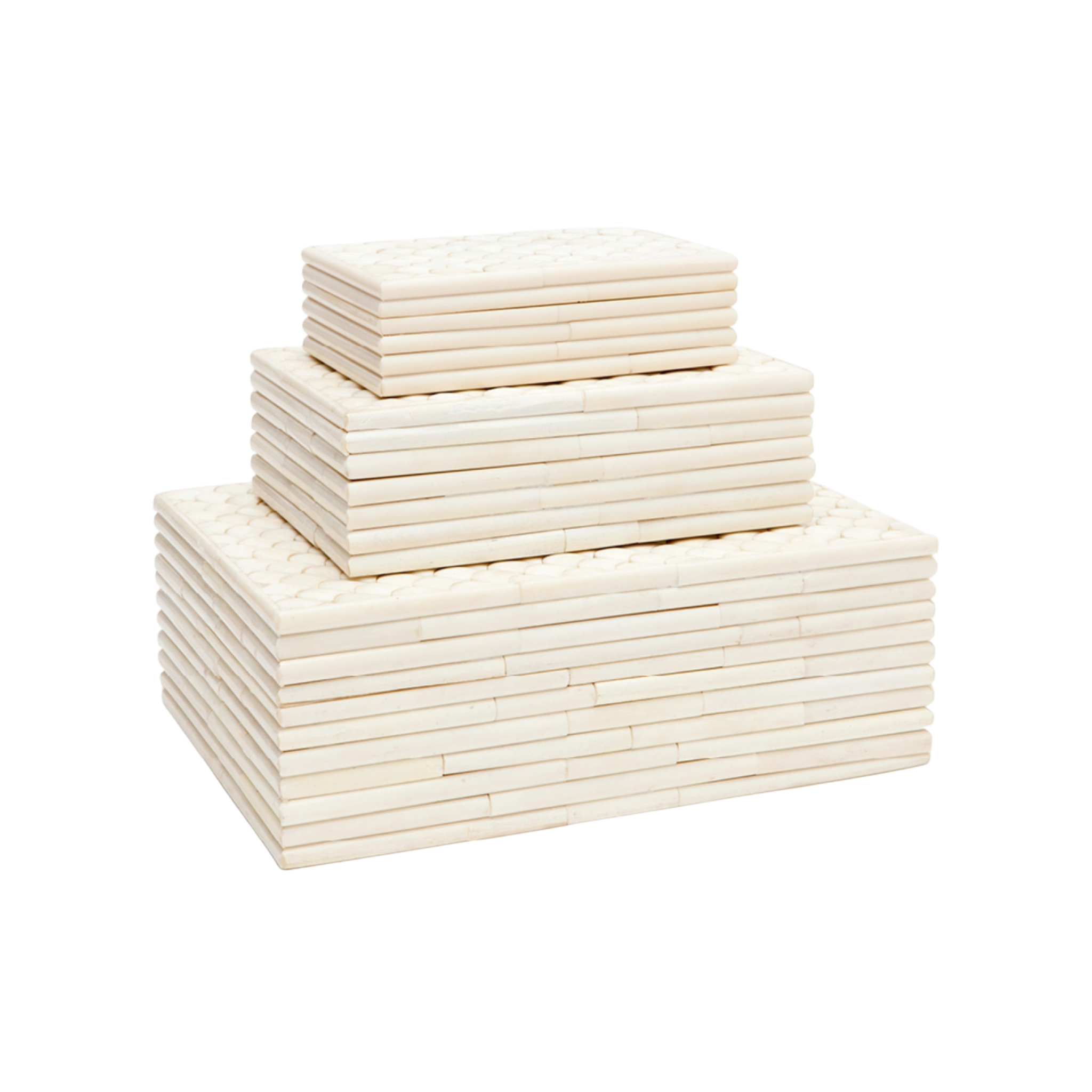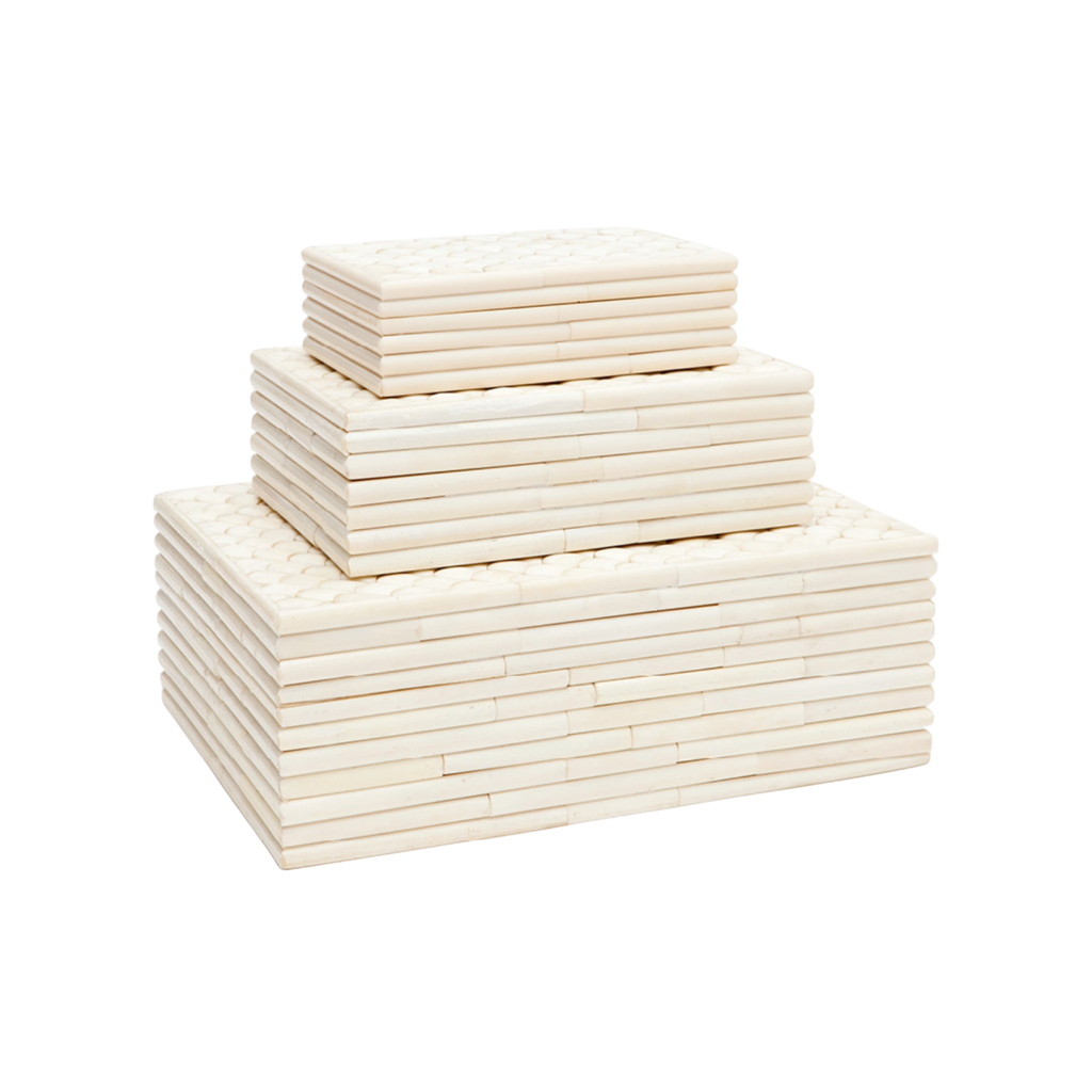 The Maxwell Box Set brings refined texture and quiet pattern to shelves, consoles, and coffee tables. Handset pieces of natural bone create a sculptural, ribbed silhouette that feels architectural yet warm, making these boxes an elegant solution for both display and storage.