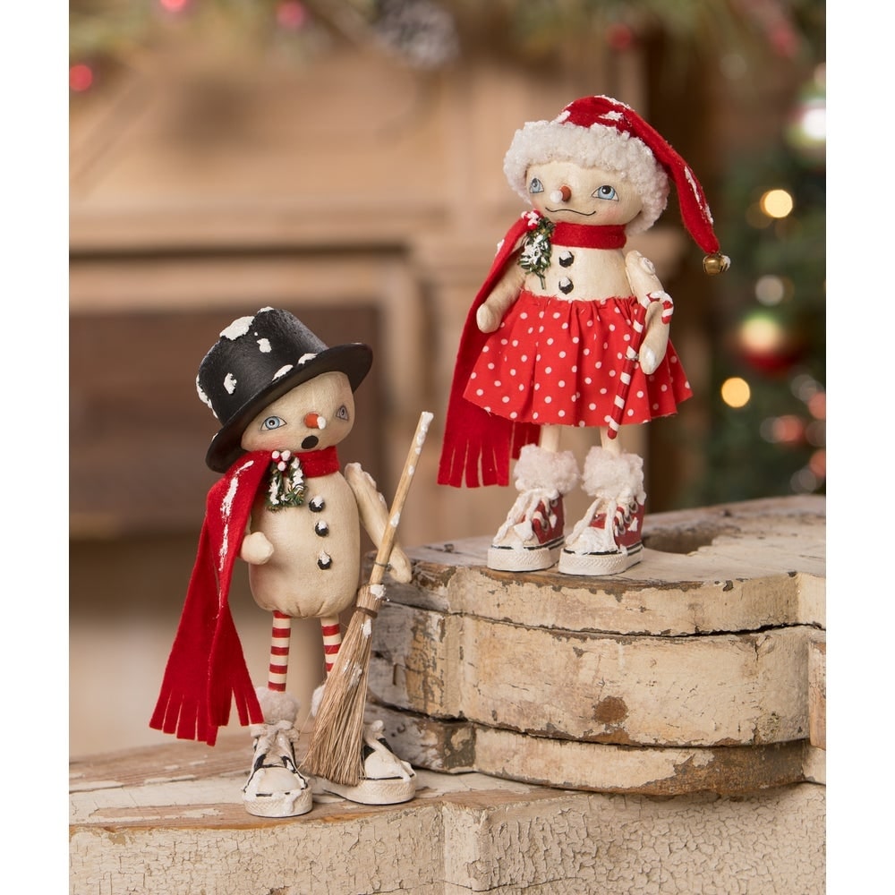 Introducing Olympia Flake by Robin Seeber, a whimsical snowgirl on stilt legs, infusing your winter decor with a playful charm. Dressed in a festive Santa hat, a red scarf, and a sweet polka dot skirt, Olympia radiates a delightful holiday spirit. Adding an unexpected and charming twist to her ensemble are the adorable little tennis shoes that complete her look. With a perfect blend of whimsy and creativity, Olympia Flake is a unique and eye-catching character, ready to bring smiles and festive cheer to your seasonal display. Embrace the joyous energy of winter with this charming snowgirl as she becomes a delightful focal point in your decor.